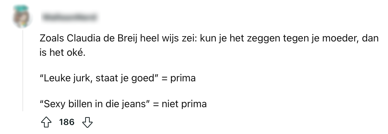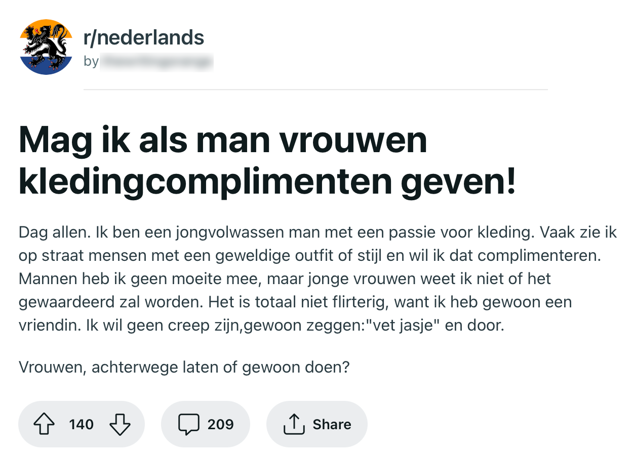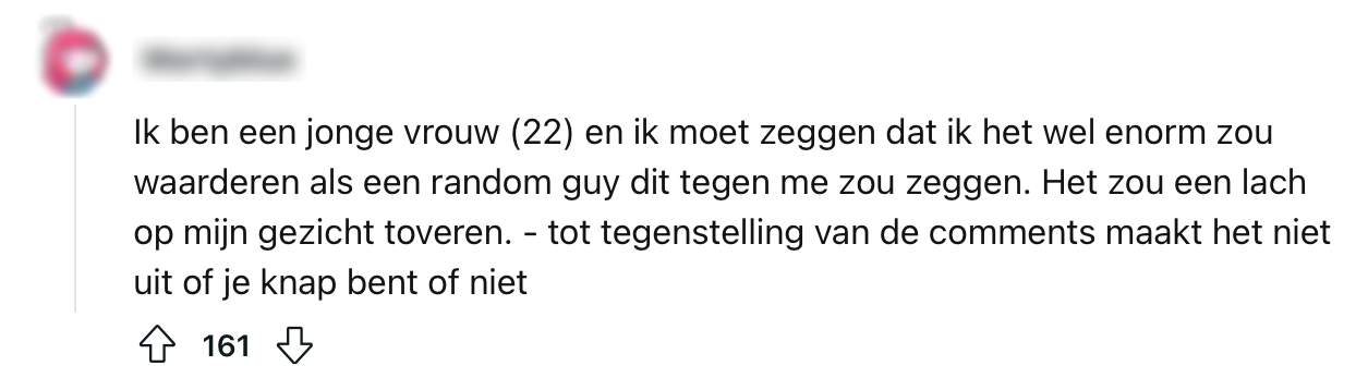 Het blijft een terugkerend probleem bij vrouwen: straatintimidatie en ongewenste opmerkingen van mannen. Die ene collega voor wie het steeds lastig blijkt te zijn om zijn ogen op de juiste hoogte te houden of een vreemde op straat die het nodig vindt om meisjes na te roepen. Vrouwen kunnen zich op veel momenten onveilig voelen en daarom vraagt deze deze Reddit-gebruiker zich af of hij als man complimenten mag geven aan vrouwen over hun kleding. De meningen hierover zijn verdeeld.