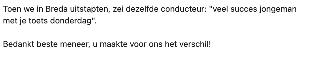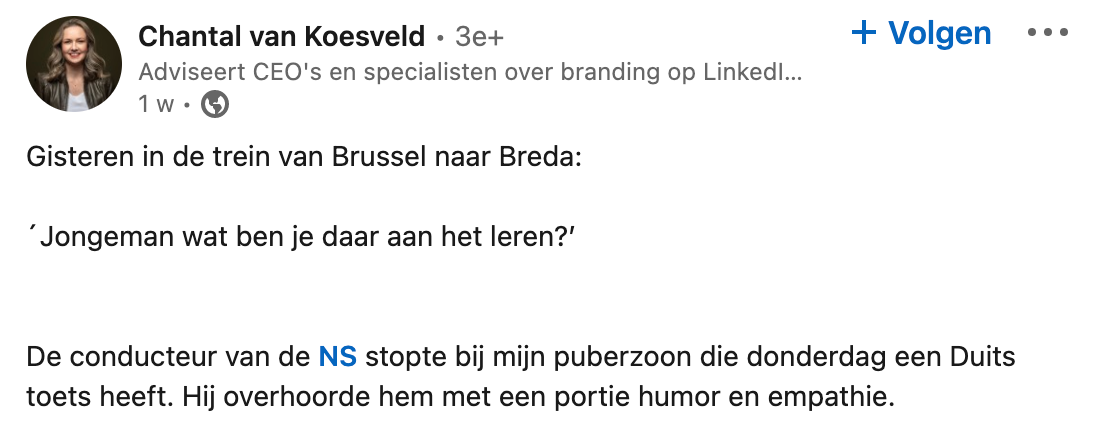 De zoon van Chantal zat hard te leren in de trein, toen hij plots aangesproken werd door een conducteur. De conducteur vroeg wat haar zoon aan het leren was. En dat leidde tot een mooie situatie.