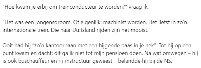 2. Ze start een gesprek met de conducteur en hij legt uit hoe hij in het vak terecht is gekomen.