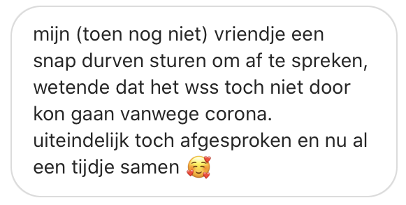 2. Daarom vroegen wij naar aanleiding van haar tweet om jullie positieve corona happenings. En dat pakte goed uit. Zo zijn er meer relaties tot stand gekomen.