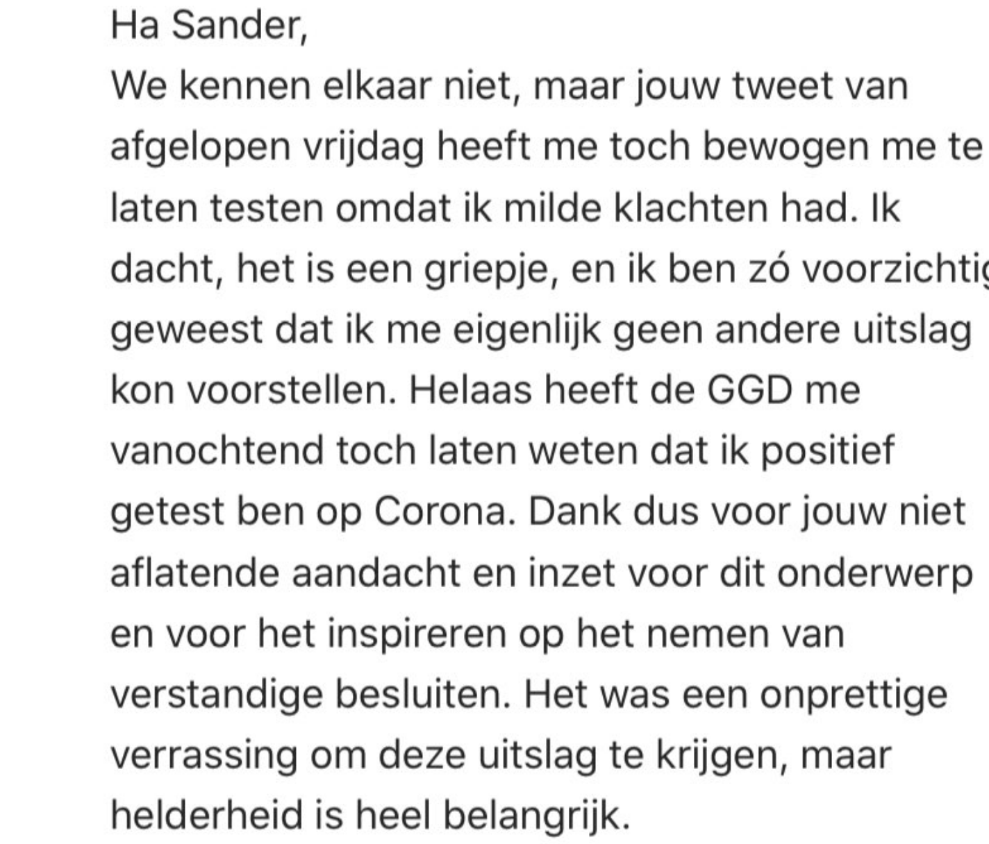 Sander de Hosson is longarts en dus beleeft en bekijkt hij de pandemie vanuit een bril waar niet iedereen over mee kan praten. Vanaf het begin spreekt hij zich uit, met heldere uitleg over het virus. Momenteel kan Sander het belang van testen bij milde klachten niet vaak genoeg benadrukken, en daar kreeg hij het levende bewijs voor in zijn inbox. Het dankbare bewijs kunnen we ook wel stellen.