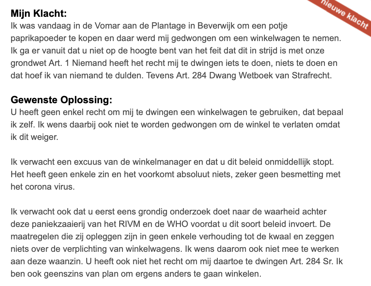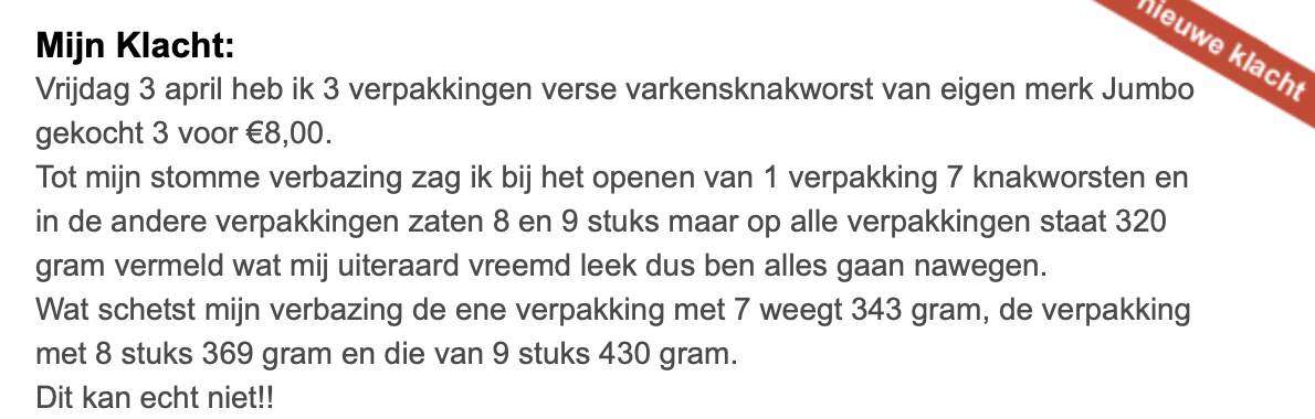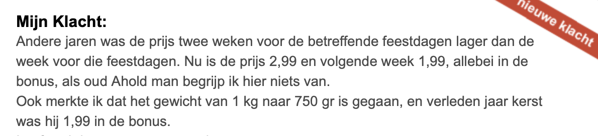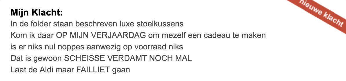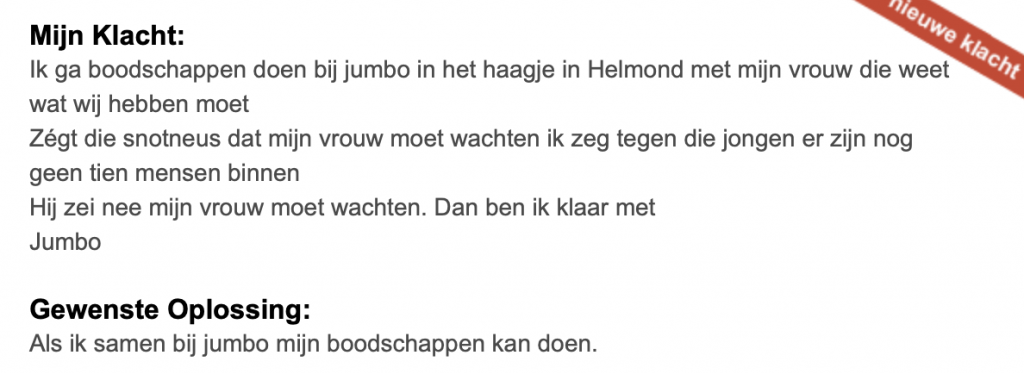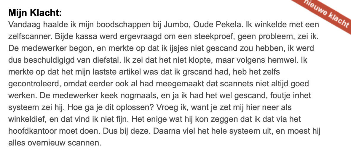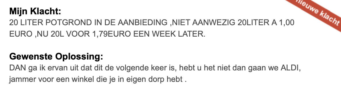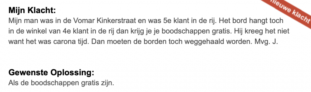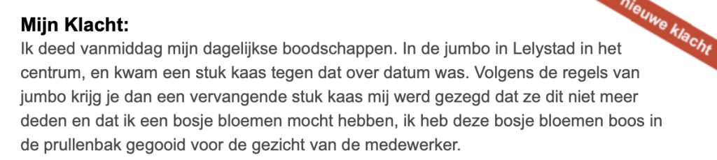1. Op websites als klacht.nl kunnen mensen klagen over van alles en nog wat. Vooral over supermarkten blijft er onveranderd veel gemekker. Zoals hier. De hele winkel puilt uit, maar mevrouw wil gratis boodschappen.
