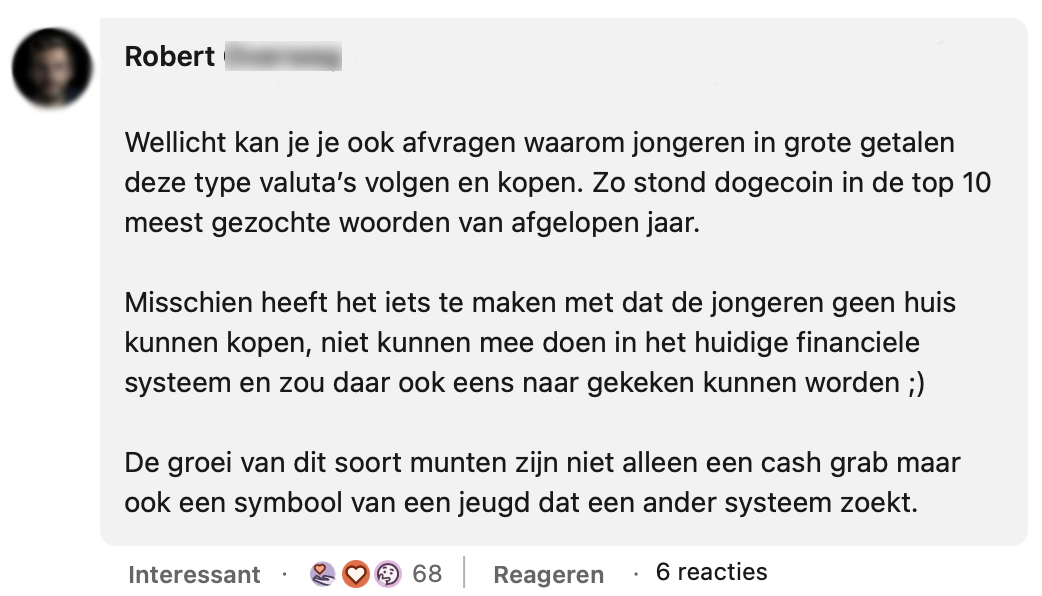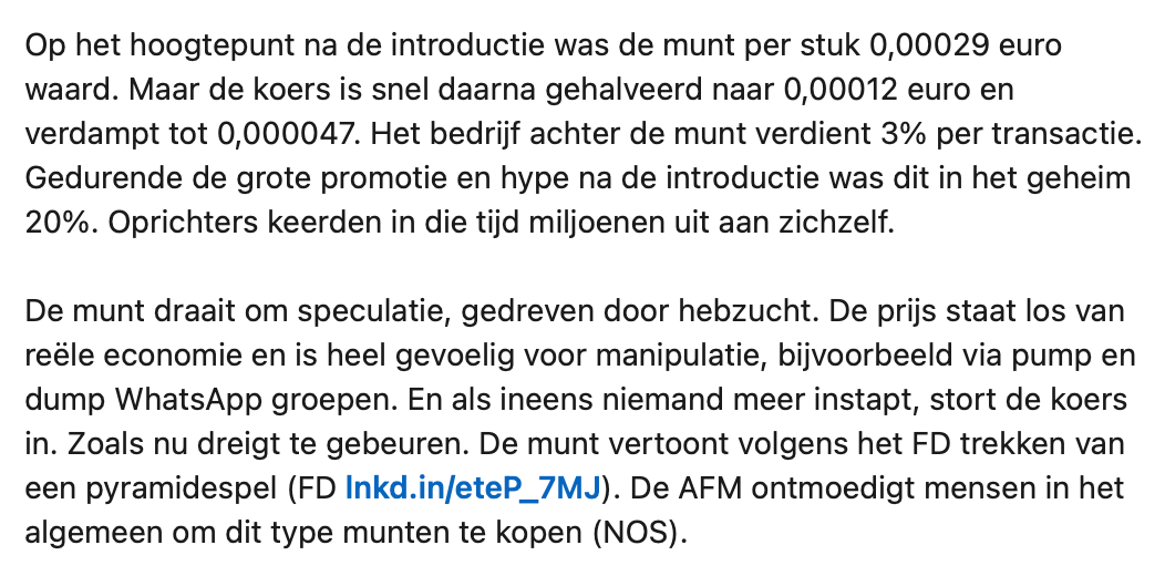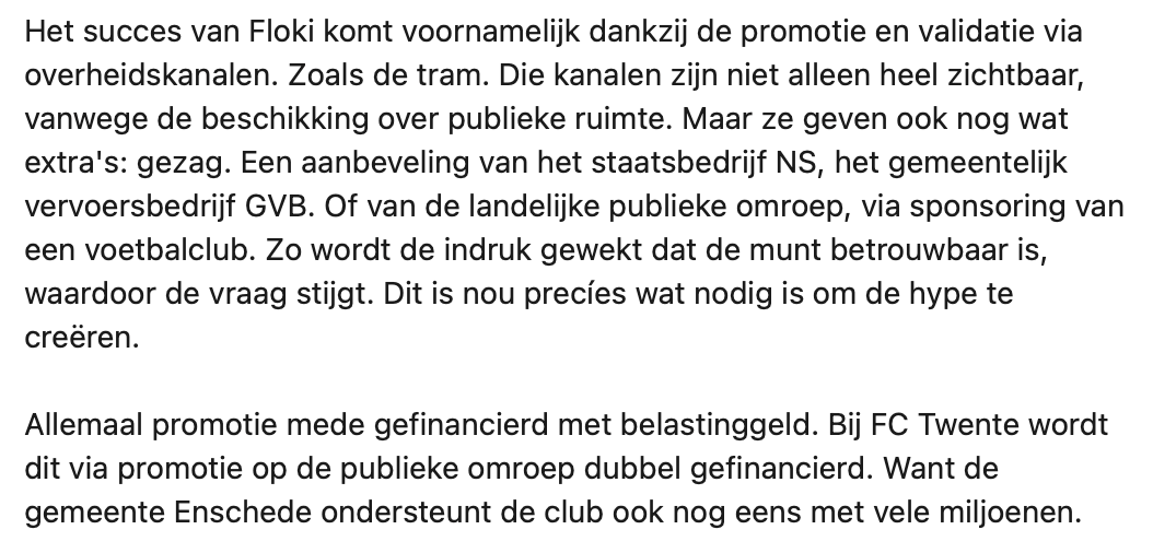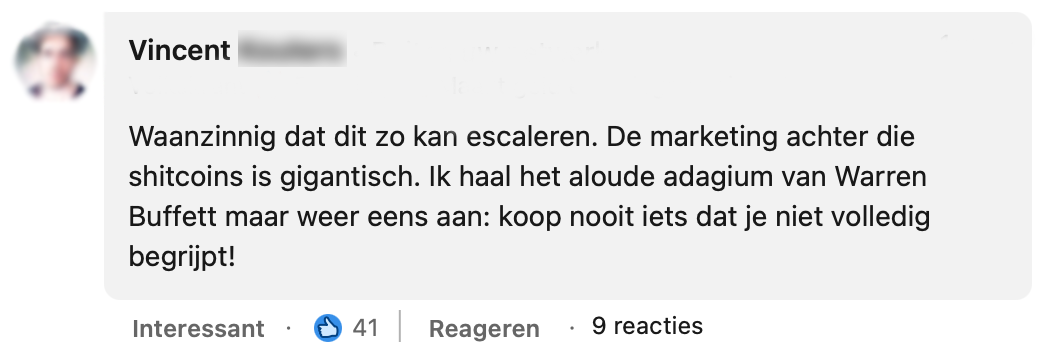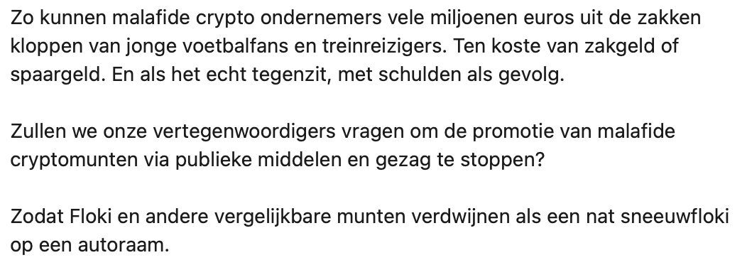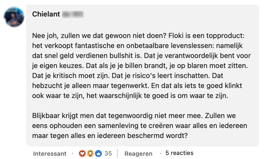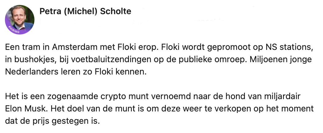 Michel Scholte deelt op LinkedIn zijn mening over de cryptomunt Floki. Hij vindt het opvallend dat hij reclames voor deze crypto op openbare plekken ziet verschijnen. Dit terwijl hij van mening is dat dit soort bedrijven jonge mensen hun zakgeld aftroggelen. Velen zijn het met Michel eens, maar toch zijn er ook nog een aantal mensen kritisch op zijn bericht.