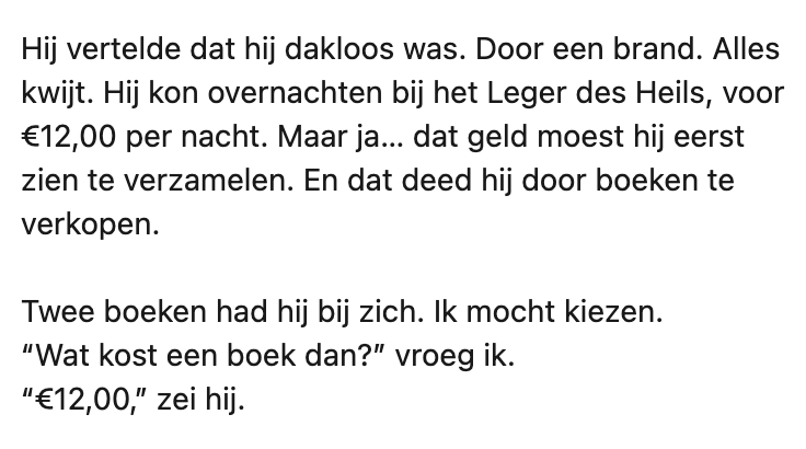 Dak- of thuisloze mensen hebben vaak bijzondere verhalen te vertellen, maar velen durven geen gesprek met ze aan te knopen vanwege vooroordelen en aannames. Wanneer Joske wordt aangesproken door een dakloze man, besluit ze hem echter aan te horen. Hij vraagt of zij een boek van hem wil kopen, maar in plaats daarvan doet ze hem een ander aanbod. En dat grijpt de man met beide handen aan. Wat volgt, is een openhartig gesprek dat Joske nog lang zal bijblijven.