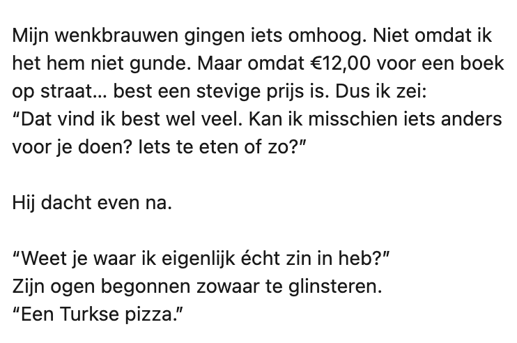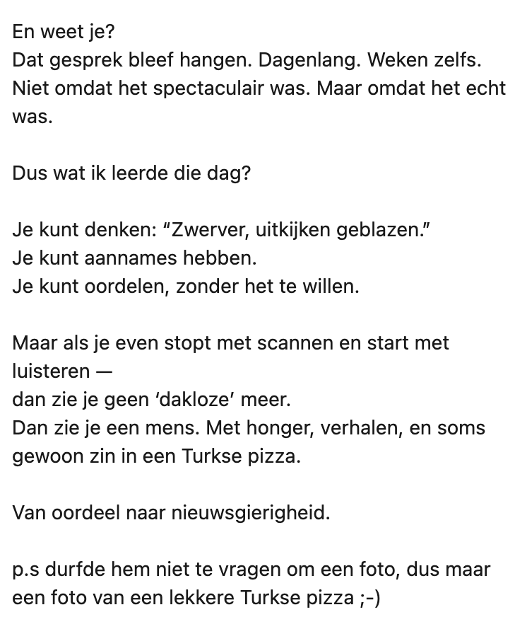 4. Hij lijkt ontzettend dankbaar te zijn voor de Turkse pizza, maar ook voor het mooie gesprek in de shoarmatent.