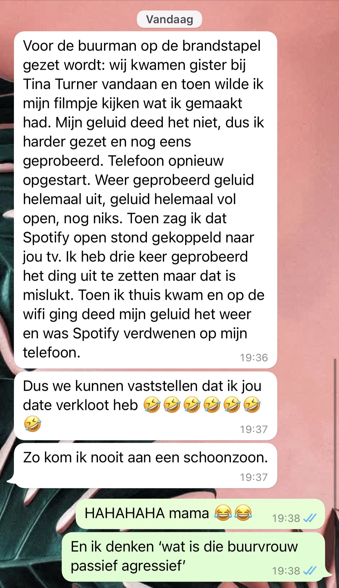 6. Maar dan ontvangt Danique een appje van haar moeder. Wat blijkt: de buurvrouw is onschuldig, het was Danique’s moeder die met Spotify aan het stuntelen was.