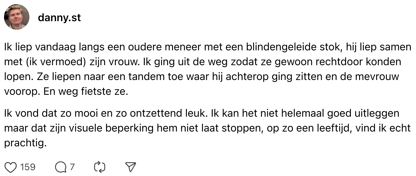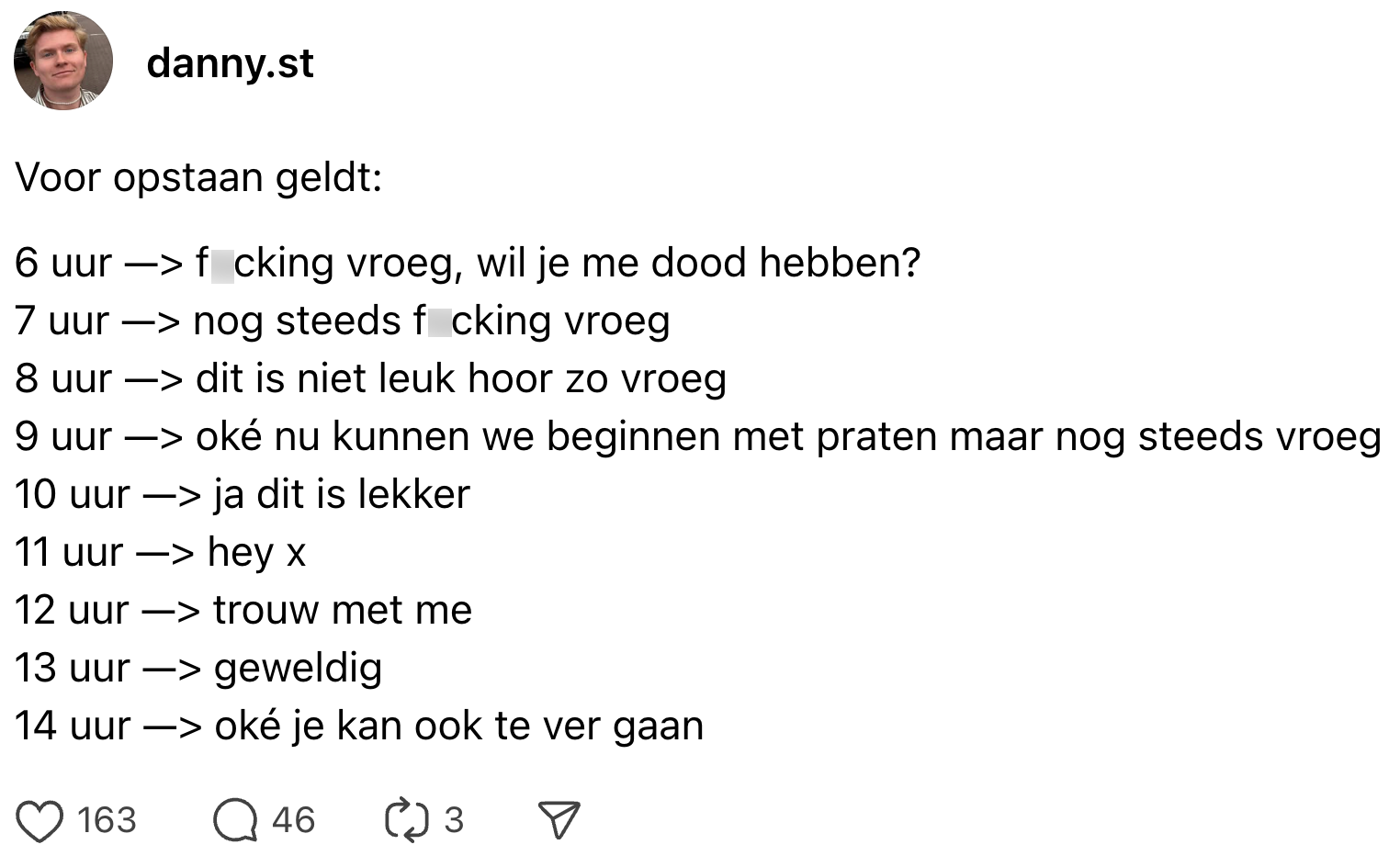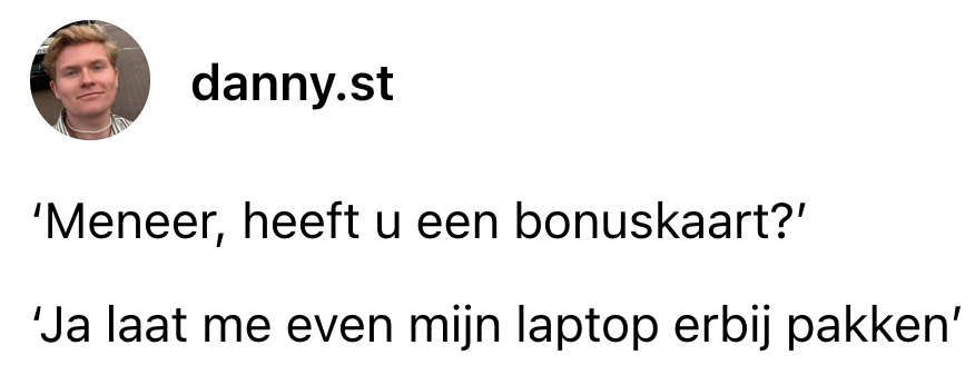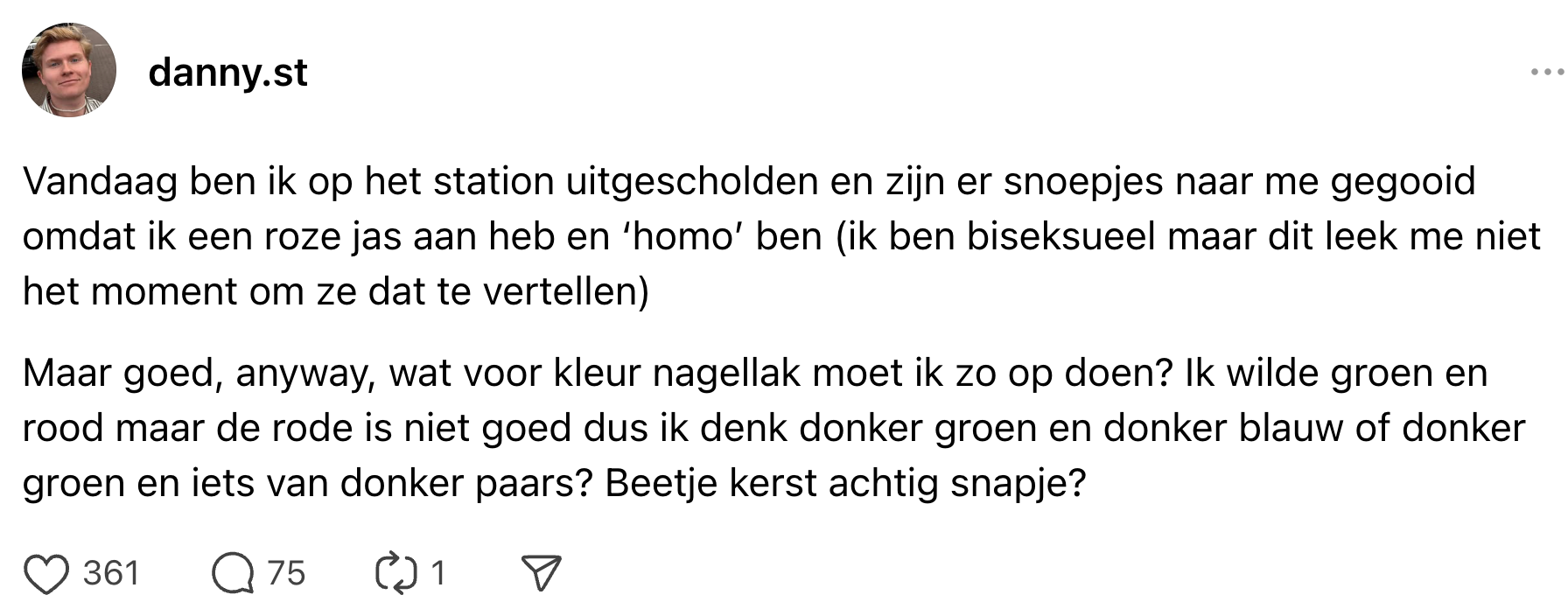 Het is niet de Munk of Froger die de show steelt, maar Danny.st, die uitblinkt op Threads. Hij weet iedereen te verbazen met zijn sarcastische hersenspinsels en zoekt regelmatig de interactie met zijn volgers op. Ook spreekt hij zich vaak uit over de LHBTQIA+ gemeenschap, wat hem een hoop volgers oplevert. Danny is genomineerd voor The Best Social Awards in de categorie Beste Threader, en déze elf posts bewijzen precies waarom.