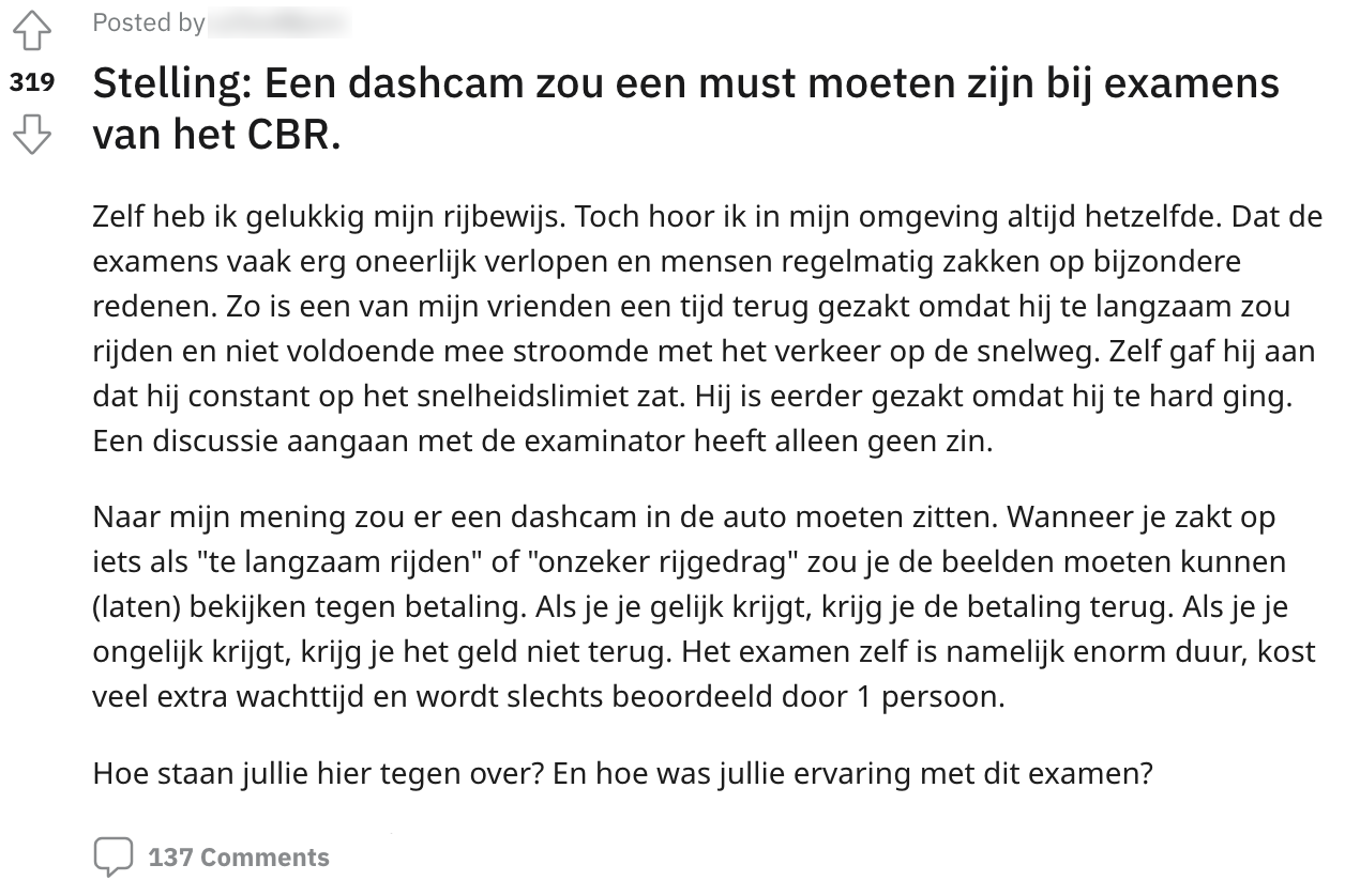 Ben jij in één keer voor je rijbewijs geslaagd? Applaus! Dan ben je een van de uitzonderingen. Er zijn namelijk genoeg mensen die hun rijexamen de eerste keer niet halen: soms met een gegronde reden, maar het komt dus ook vaak genoeg voor dat de reden niet zo gegrond is. Super frustrerend, natuurlijk! Daarom vroeg deze Reddit-gebruiker zich af wat we ervan zouden vinden als er naast een examinator, óók een dashcam instapt bij de rijexamens.