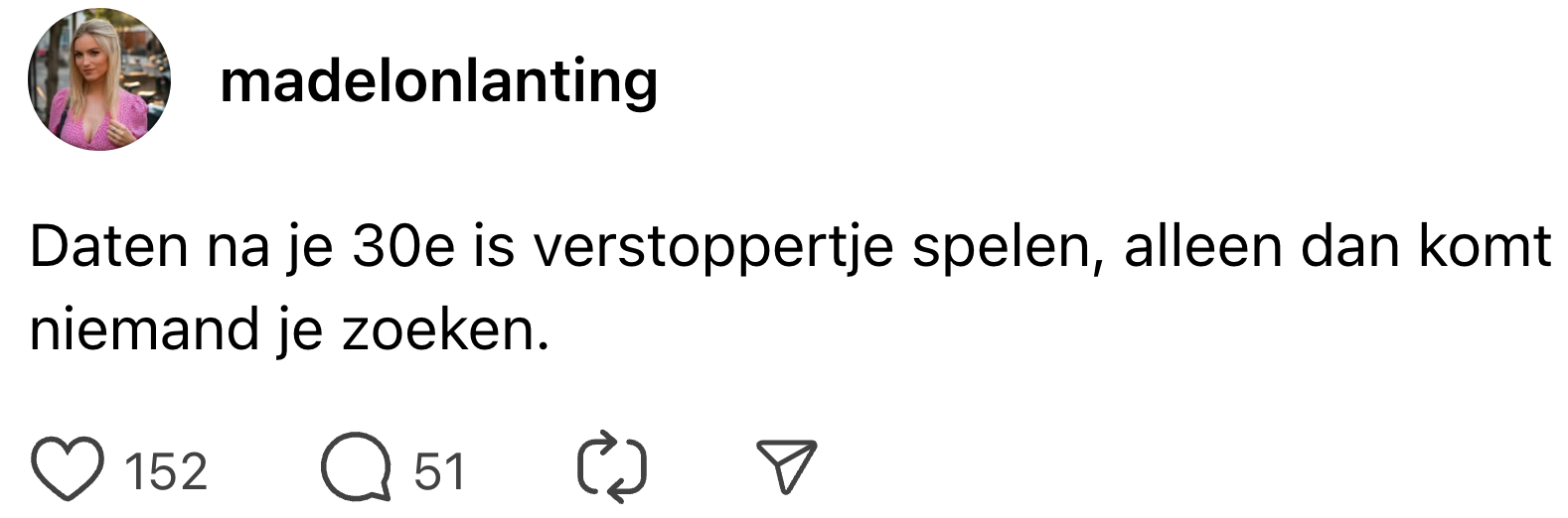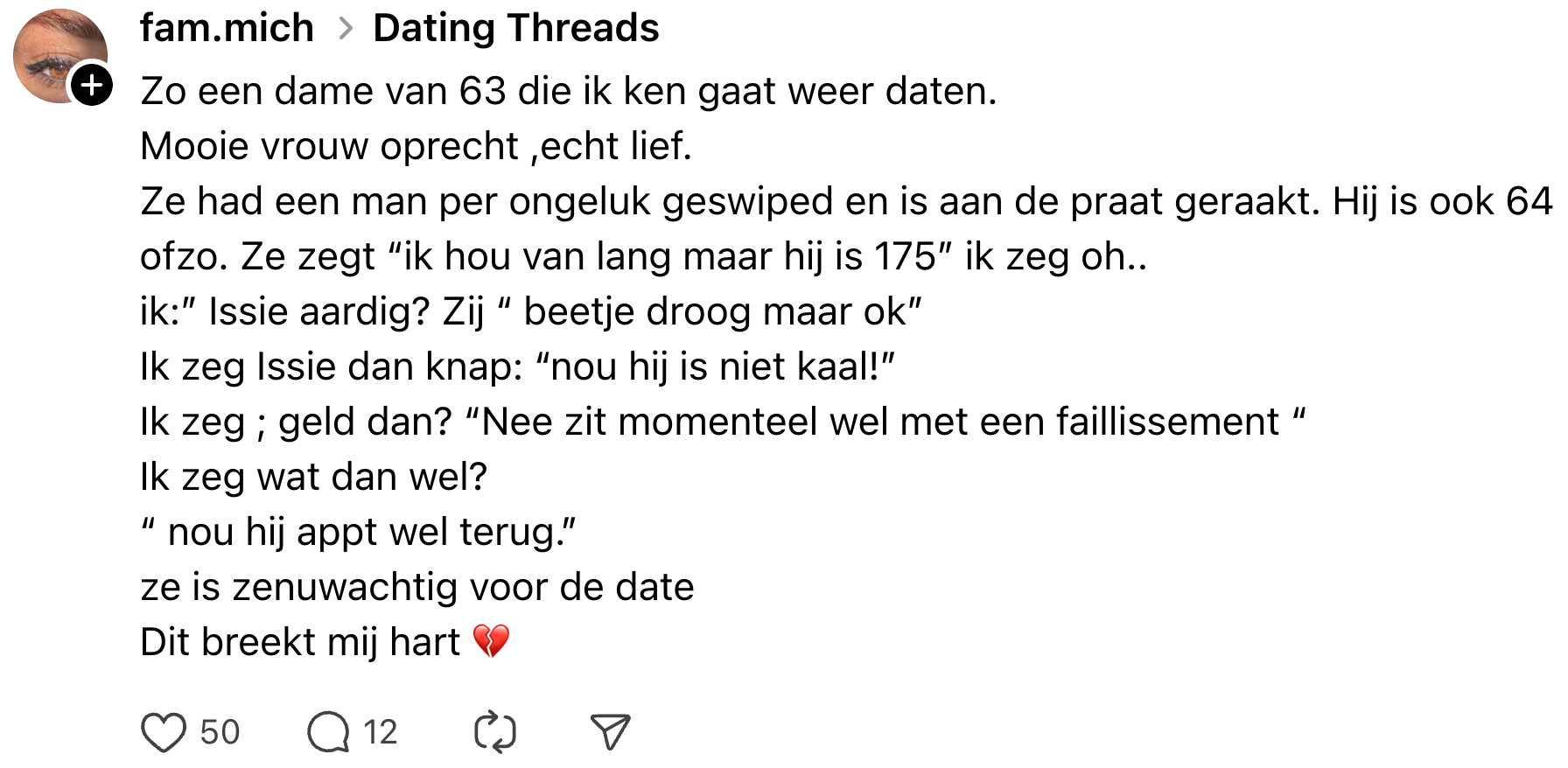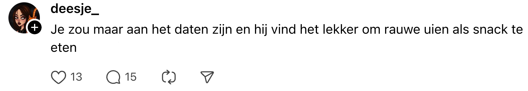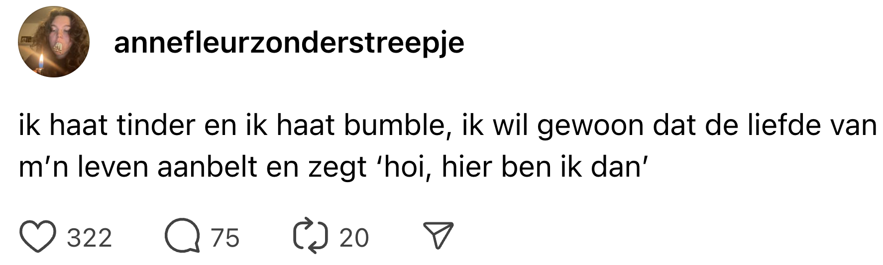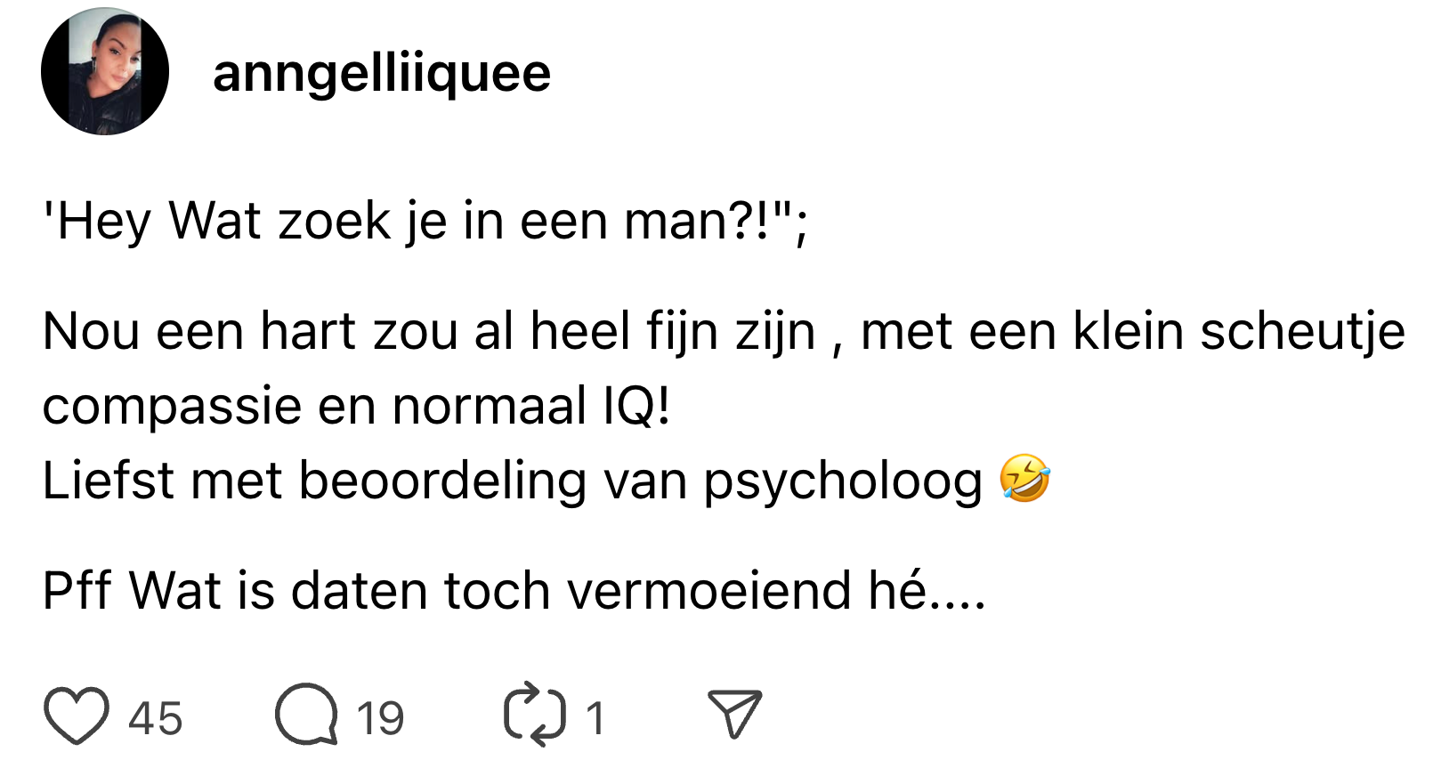 Daten in 2025 is net als het optuigen van de kerstboom. Je verwacht flink versierd te worden met een enorme piek, maar je eindigt vaak met een teleurstellend klein ding, zonder verrassingen onderin. Kortom, het leven als single zit niet altijd mee. Om je leed wat te verzachten, hier hebben we hier 21 verhalen waardoor die wanneer-neem-je-eens-iemand-mee-vragen van tante Gerda maar voor lief neemt.