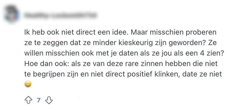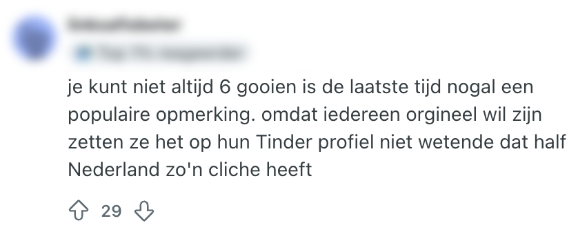 Mensen met gigantische vissen in hun armen, spiegelselfies in de sportschool, groepsfoto’s op Lowlands en slechte openingszinnen: als je al een tijdje rondzwerft in de wondere wereld van datingapps, ben je ze allemaal al tientallen keren tegengekomen. Originaliteit is vaak ver te zoeken. Een Nederlander is lekker aan het swipen en merkt op dat veel singles precies dezelfde uitspraak op hun profiel hebben staan. Diegene is nieuwsgierig naar het verhaal achter deze veelvoorkomende bio en vraagt Reddit om raad.