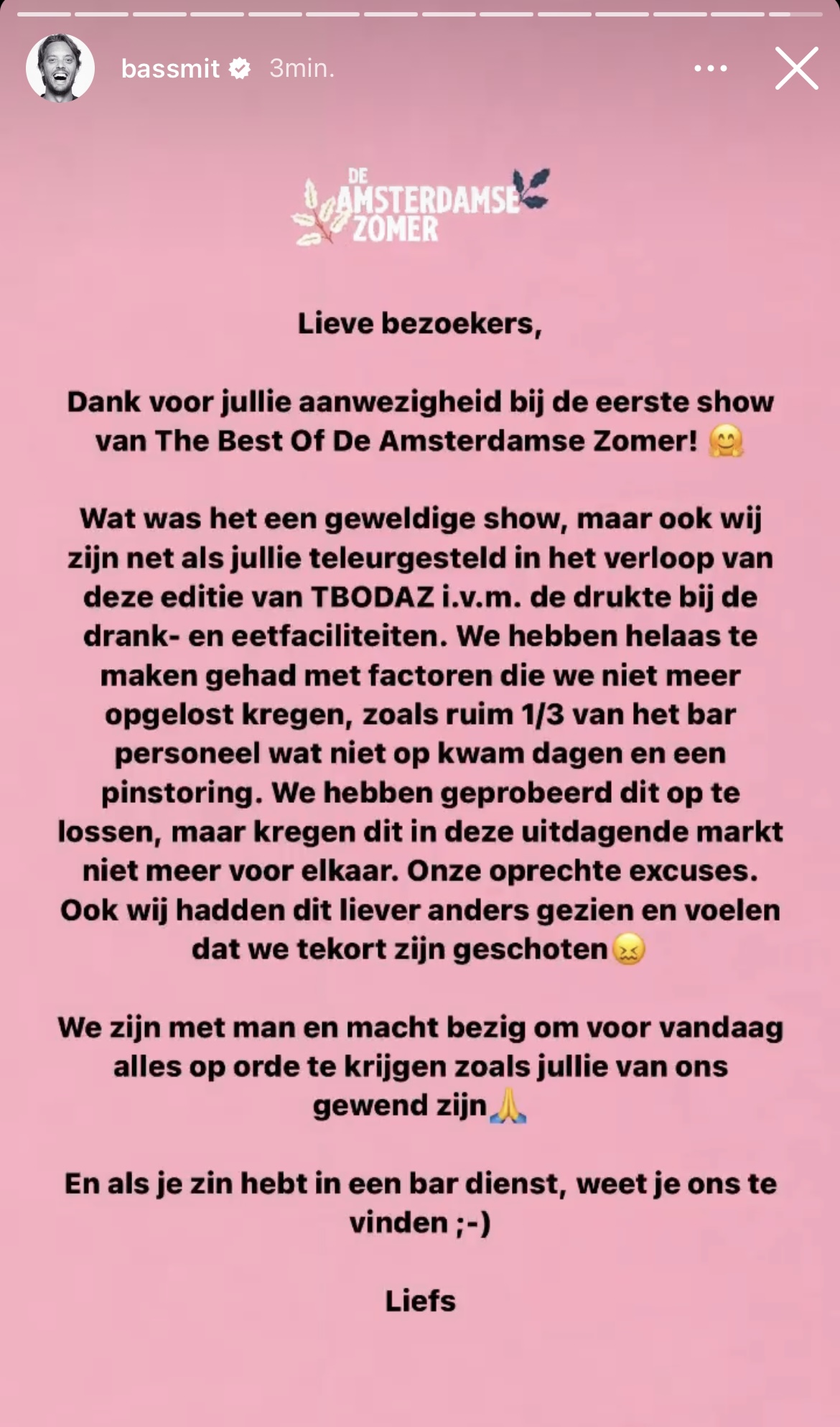 Dit weekend vindt het event ‘De Amsterdamse Zomer’ van Bas Smit en Nicolette van Dam plaats. Een event in het Olympisch Stadion waarbij artiesten van eigen bodem optreden. Gisteravond ging het festival van start en helaas voor Bas en Nicolette liegen de meningen er niet om. Want als we de comments op social media moeten geloven, was het één groot drama: uren in de rij staan voor een drankje, slecht geluid en wijn die op was rond een uur of negen.