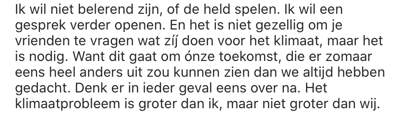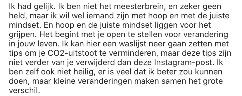 “Tot ik alle posts over de branden in Australië zag. Ik vond het verrassend en fijn om te zien dat anderen daar ook mee bezig zijn en zag een kans om het gesprek verder te openen.”