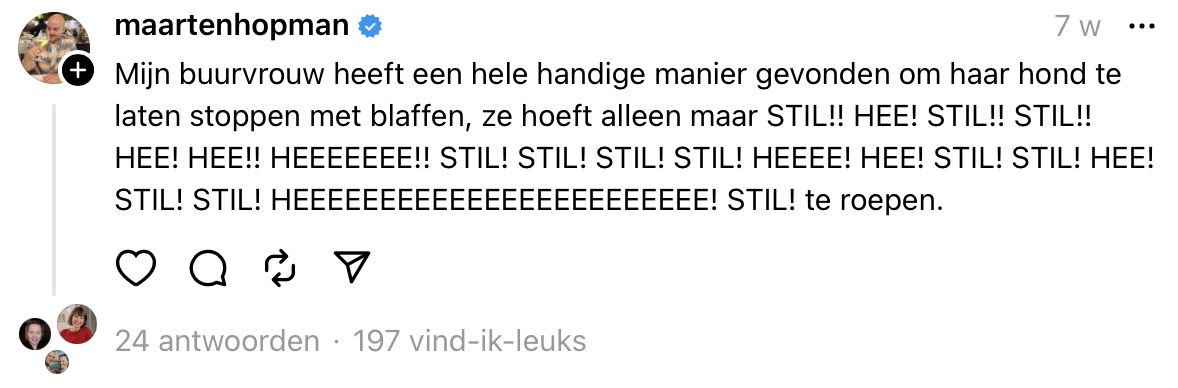 7. Ze riep maar 42 keer en toen was de hond echt direct stil.