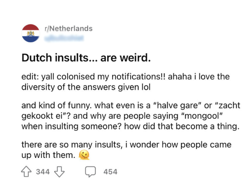 1. Deze redditor is best verbaasd over de gekke scheldwoorden die wij in Nederland allemaal gebruiken.