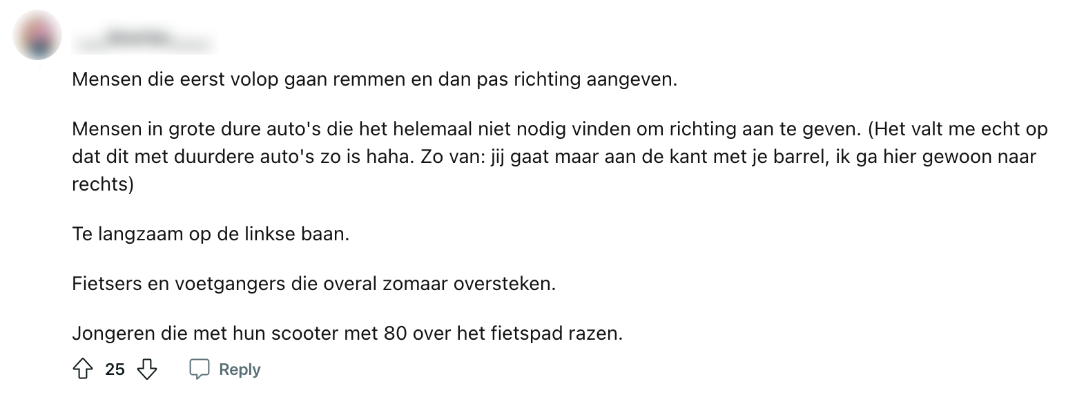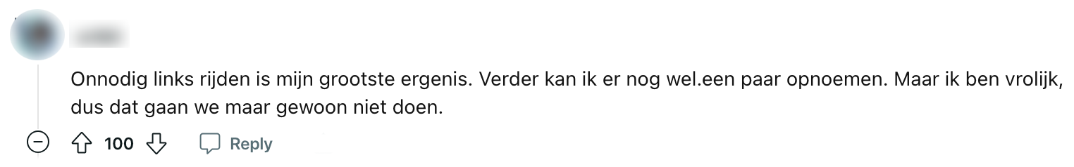 Hoe je het wendt of keert, deelnemen aan het verkeer is en blijft één van de grootste frustraties. Bij negen van de tien Nederlanders begint het bloed dan nu ook meteen te koken. Het is dan ook belangrijk om die frustraties er af en toe effe lekker uit te gooien. Sommigen doen dit al schreeuwend en scheldend achter het stuur en een ander doet dat online. Toen een Reddit-gebruiker naar verkeersirritaties vroeg, ontstond er al snel een kilometerslange file aan irritaties.
