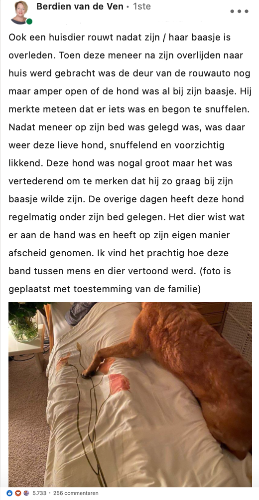 Afscheid moeten nemen van een geliefde is altijd erg moeilijk. Uit het indrukwekkende verhaal van Berdien van de Ven, blijkt dat niet alleen mensen het lastig vinden om afscheid te moeten nemen. Berdien is uitvaartbegeleidster en ziet dus regelmatig wat voor effect het plots wegvallen van hun baasje op huisdieren heeft. Ze pleit dat het dan ook erg belangrijk is voor een dier om afscheid te kunnen nemen van hun geliefden.