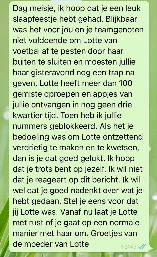 Mijn kind werd de laatste maanden stelselmatig gepest en buitengesloten. Zaterdagavond tijdens een slaapfeestje vonden deze meiden het nodig om haar meer dan 100 x te bellen en haar meer dan 100 appjes te sturen. Ik heb ze onderstaand bericht gestuurd. #Mamaisboos #StopPesten!! pic.twitter.com/nEm7Jw9och