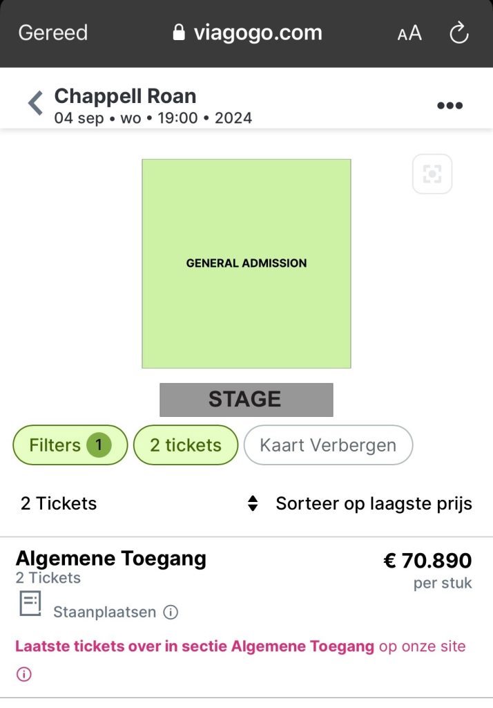 1. Dirk heeft op Viagogo een concertkaartje weten te bemachtigen voor zangeres Chappell Roan, maar het zweet breekt hem uit als hij het afschrift ziet.