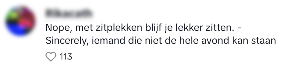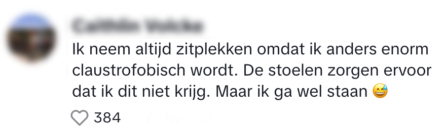 8. Voor bepaalde mensen is een staanplaats gewoon niet te doen, maar zitten op een zitplek ook niet.