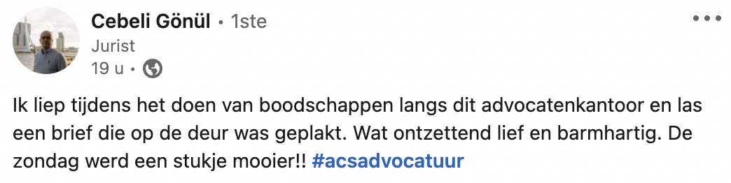 1. Cebeli plaatst het briefje dat hij tegenkomt op de deur van een advocatenkantoor op LinkedIn.