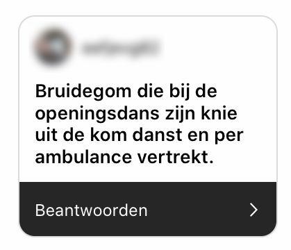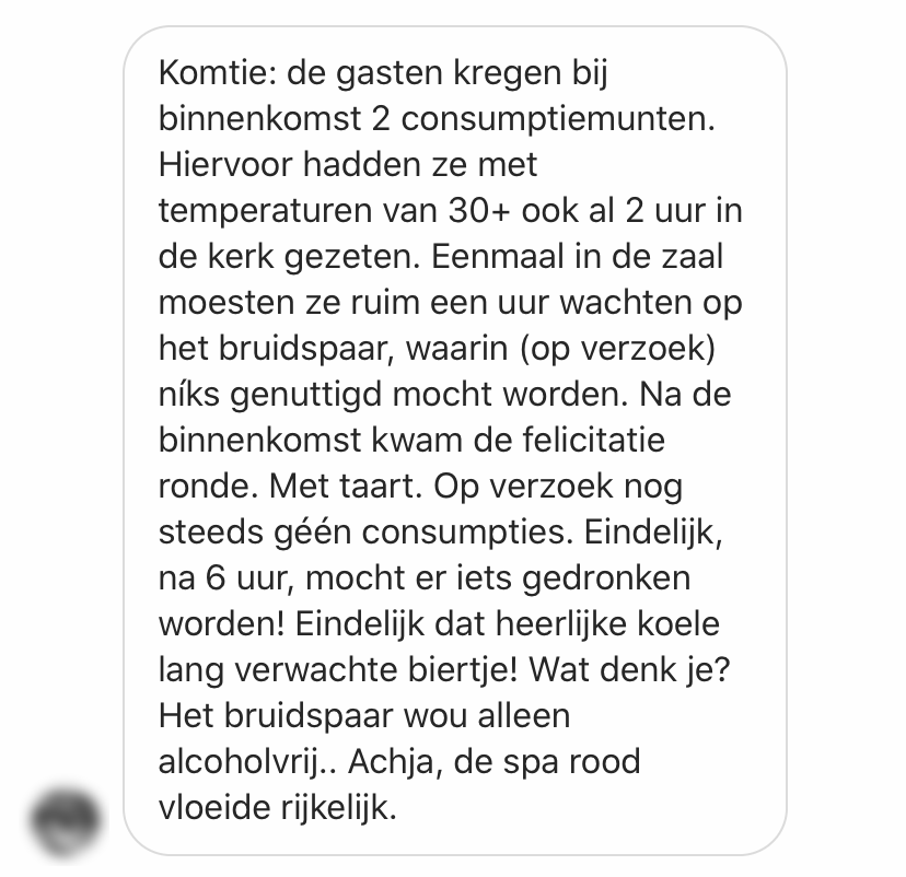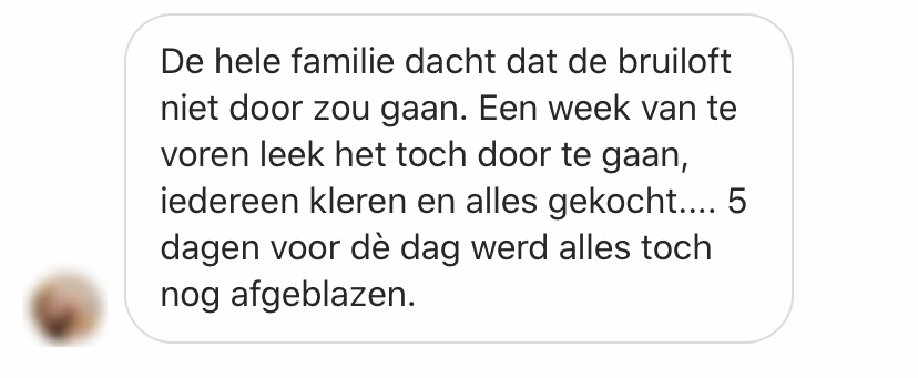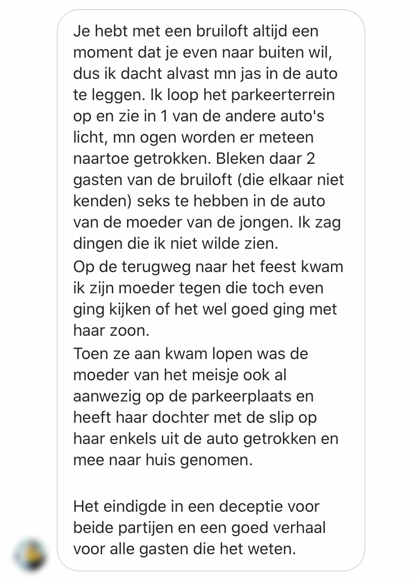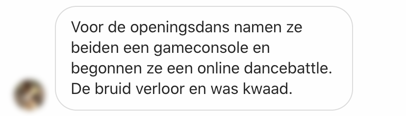 Het zou de mooiste dag van je leven moeten zijn: je bruiloft. Zelfs onder omstandigheden van de ‘gekke tijden’ waar we in zitten. Maar voor sommigen – lees: heel veel van jullie – is het vooral een dag waarop de raarste dingen gebeuren. We vroegen jullie naar je gekste ervaring op een bruiloft en jullie antwoorden stelden absoluut niet teleur.