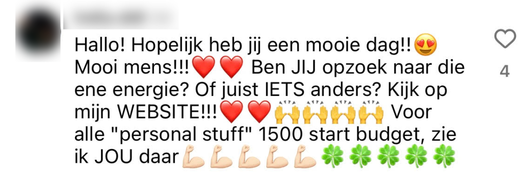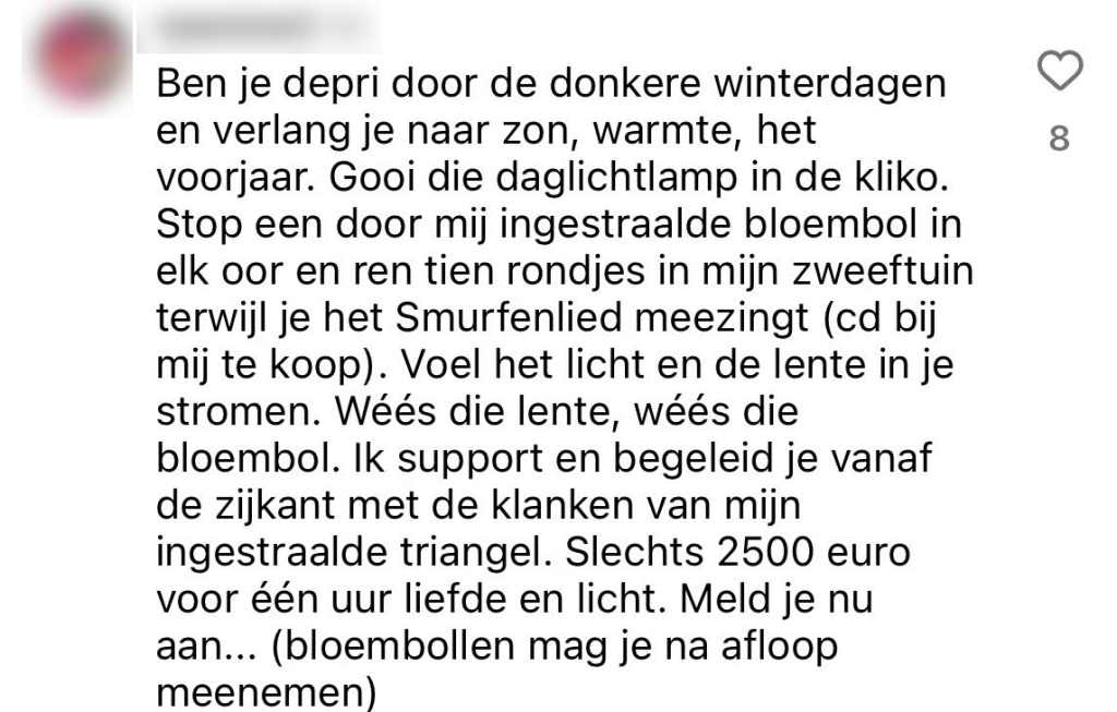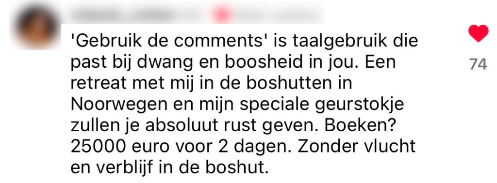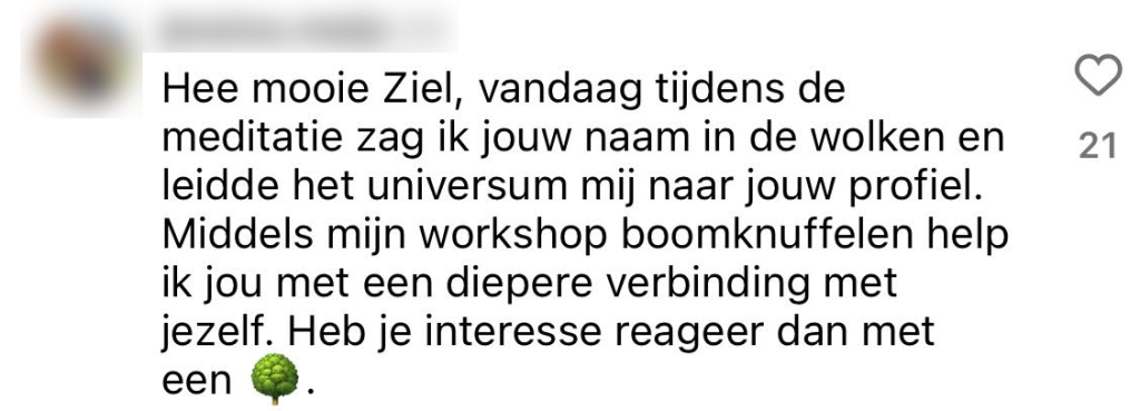 Hey jij daar, mooie ziel! Zit je net lekker hersenloos door je socials te scrollen, krijg je weer zo’n DM van een ‘holistisch coach’ in je gezicht geduwd. Alsof die chakra-healing of paarden-coaching de innerlijke draak in jou – en je zestien mental breakdowns per dag- ooit zouden kunnen temmen. Daar is natuurlijk minstens een klankschaalbehandeling van 10.000 euro per minuut voor nodig, duh. We vroegen jullie op Instagram om onze comments te gebruiken als holistisch coach die in je DM slide en het blijkt wel dat jullie flink in je kracht staan.