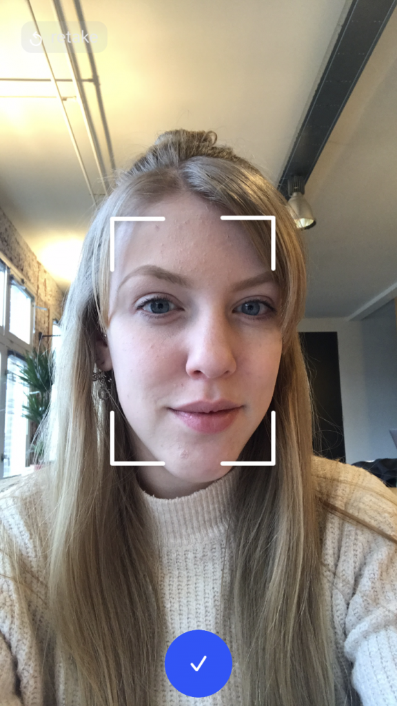 5. Als je tevreden bent, tik je op het blauwe vinkje. Je hoeft je geen zorgen te maken om privacy-inbreuk. De app vertelde aan The Next Web dat ze de foto’s verwerken en daarna meteen verwijderen. Wel onthouden ze je gezicht en gezichtstrekken, maar dat wordt met niemand gedeeld.