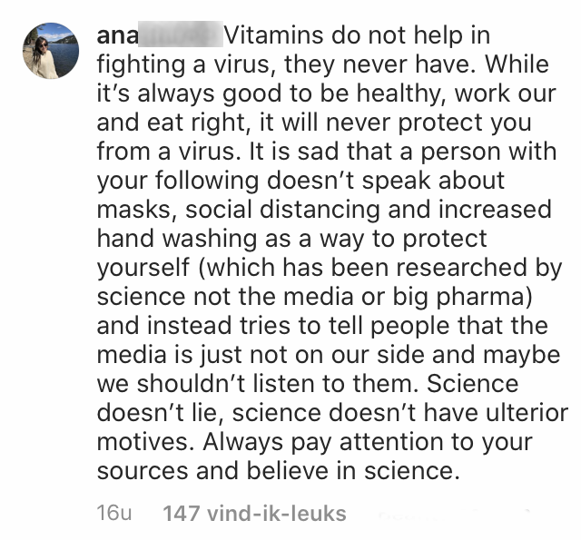 5. En uiteraard zijn er ook veel kritische reacties. Veel mensen vinden dat Doutzen met haar bereik juist zou moeten oproepen om alle maatregelen in acht te nemen.