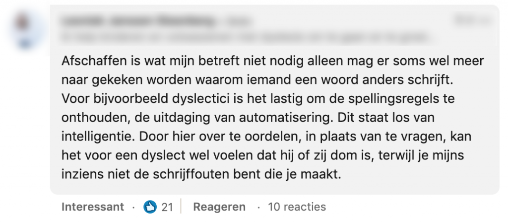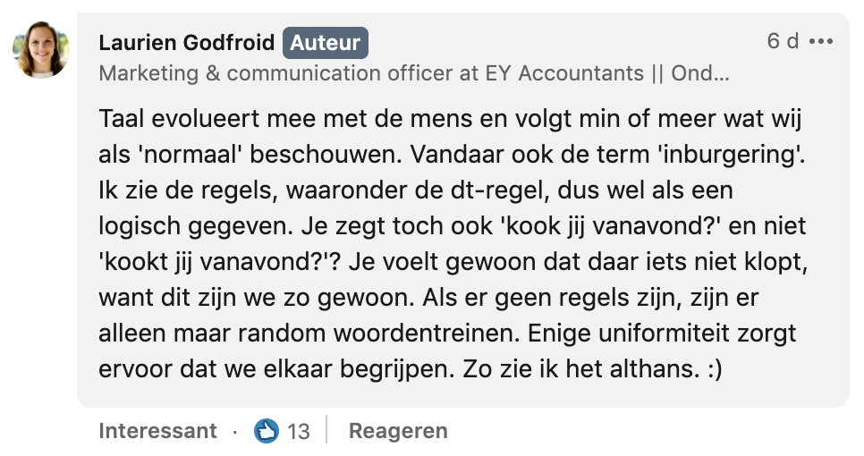 Een van de lastigere dingen aan de Nederlandse taal zijn voor veel mensen de d’s en t’s. Ondanks de oneindige pogingen van Nederlands docenten om ’t kofschip en ’t fokschaap er in te stampen, worden er nog veel fouten gemaakt. Dit viel ook Laurien op, en volgens haar doet het pijn aan de ogen. Hoewel de regel volgens haar gewoon mag blijven bestaan, denkt ze dat er een kans is dat de dt-regel binnenkort helemaal zal verdwijnen. Ze vraagt op LinkedIn wat mensen daarvan vinden, en start een discussie.