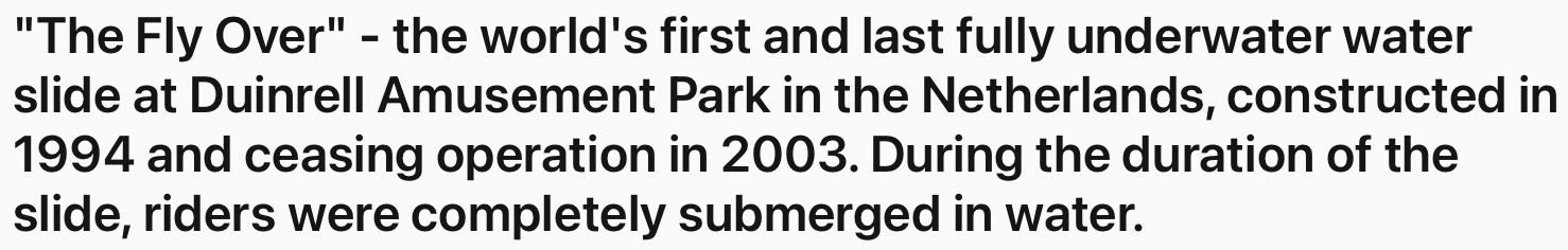 Waar de een enorm lekker gaat op adrenaline, krijgt de ander alleen al van het woord ‘achtbaan’ de rillingen. Maar sommige attracties vindt bijna iedereen next level. Zo duiken er de laatste tijd beelden op van de ‘Fly-over’ van het Tikibad in Duinrell: een glijbaan waar je in achttien seconden doorheen kon glijden, maar wel volledig onder water. De baan is al tientallen jaren gesloten, maar jaagt Nederlanders nog altijd de stuipen op het lijf…