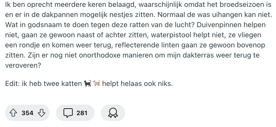 Als het buiten warm is, kan het best fijn zijn om een dakterras te hebben. Déze bewoner heeft het geluk er eentje te bezitten, maar er is één klein probleem: diegene kan er geen gebruik van maken. Het dakterras is namelijk veroverd door een groep duiven. En aangezien de situatie langzamerhand uit de klauwen begint te lopen, vraagt de bewoner via Reddit om hulp. Anderen kunnen hun snavel uiteraard niet houden en komen met de meest bizarre oplossingen.