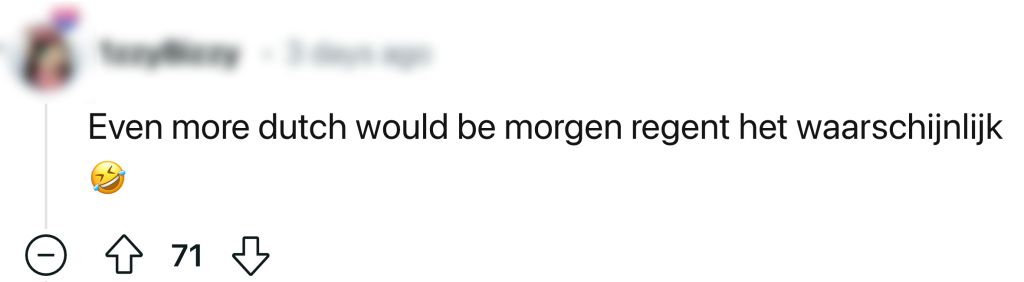 Dat de Nederlandse taal moeilijk te leren is voor mensen die er niet mee zijn opgegroeid, is geen geheim. Er zijn veel verschillende dialecten, waarvan sommige gewoon een eigen taal op zich zijn en de ‘ggghh’ is voor veel mensen lastig uit te spreken. Probeer een toerist maar eens ‘Scheveningen’ te laten zeggen en je kunt je lol op. Maar niet alleen de uitspraak zorgt voor komische momenten. Deze redditor heeft de moedige stap genomen om Nederlands te leren via Duolingo, maar diens prachtige zin wordt bruut gecorrigeerd. En daar zijn Nederlanders het to-taal niet mee eens…