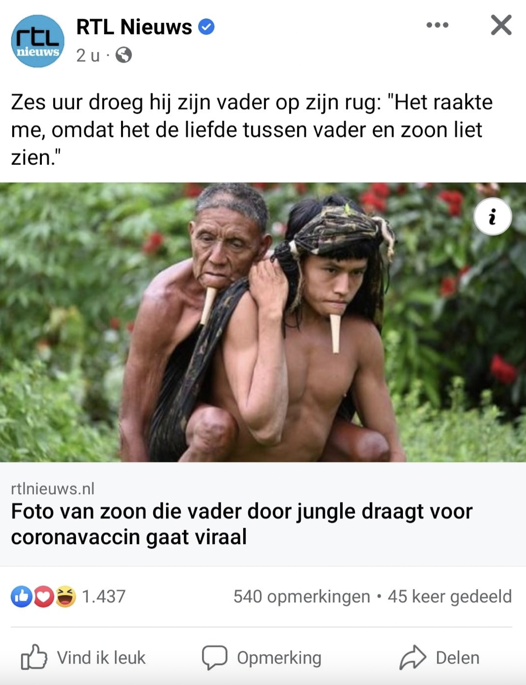 RTL Nieuws publiceerde gisteren een foto van zoon die vader op zijn rug door jungle draagt voor coronavaccinatie. Op Twitter circuleert nu een bericht dat die foto ten onrechte voor vals verklaart. https://t.co/69sExWa8cc 1/5