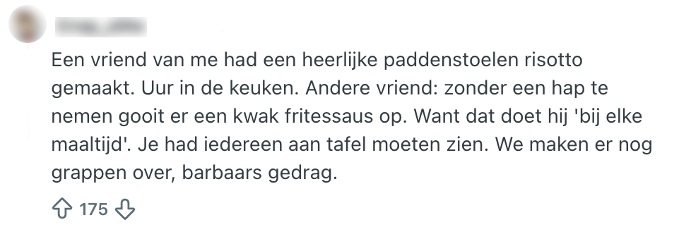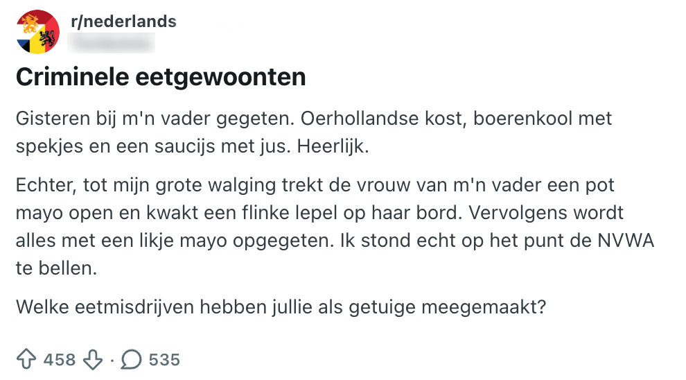De Nederlandse keuken staat niet bekend om de vele kruiden en variatie aan gerechten. Gekookte aardappelen, wat groenten, hooguit een snufje zout en prakken maar – zo simpel is het. Toch weten sommige Nederlanders het gebrek aan smaak te overtreffen. Een Reddit-gebruiker vraagt anderen naar criminele eetgewoonten die zij hebben gezien en krijgt een overvloed aan reacties waardoor je je smaakpapillen ineens erg dankbaar bent.