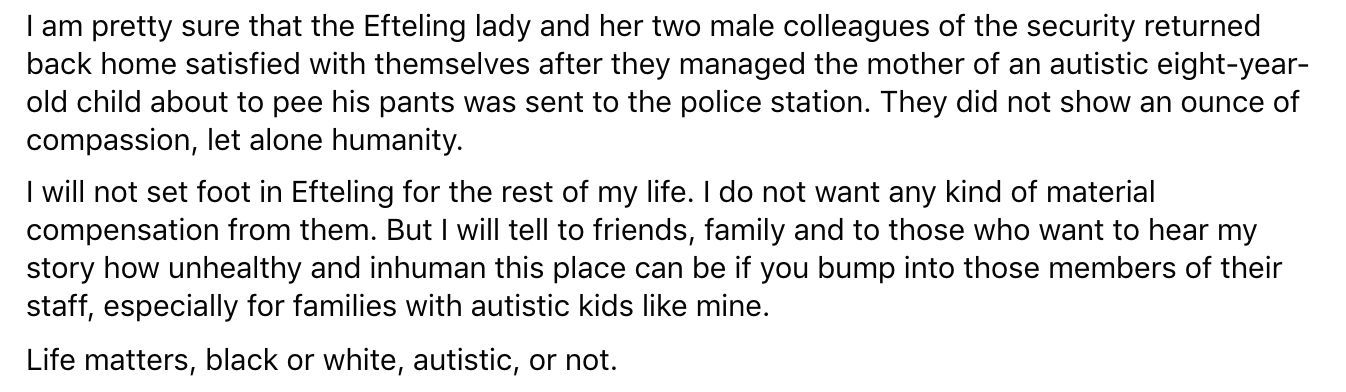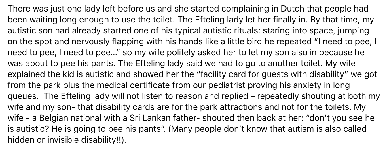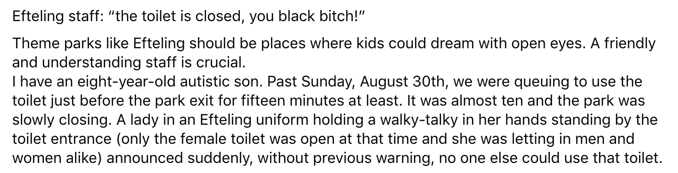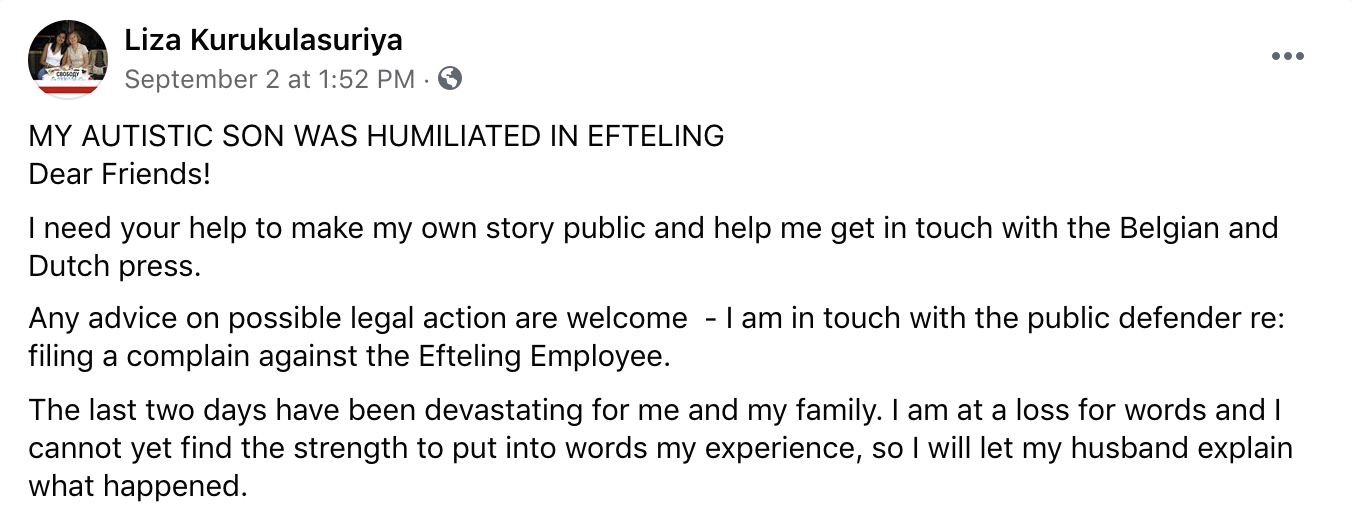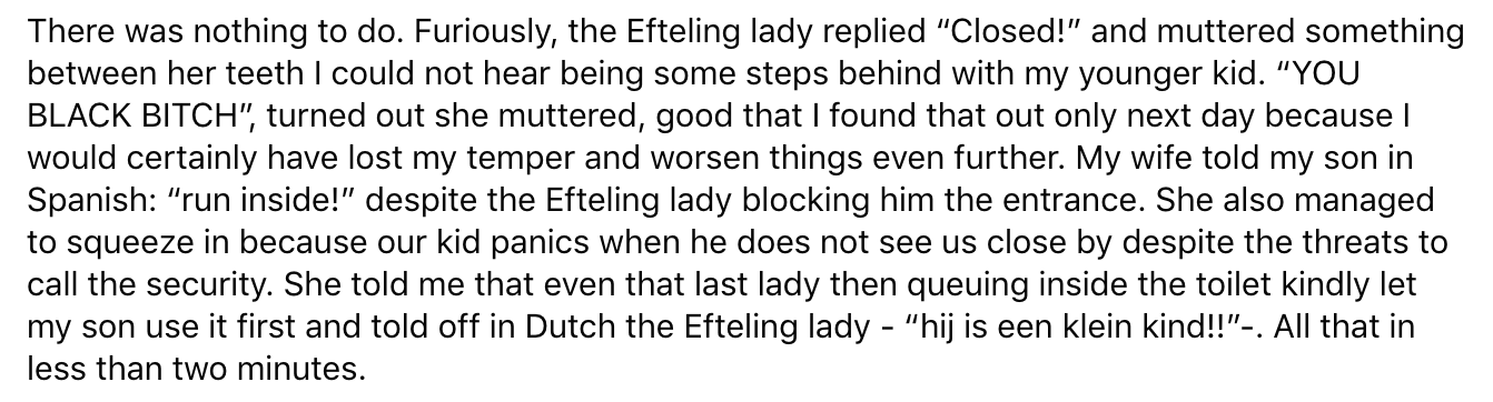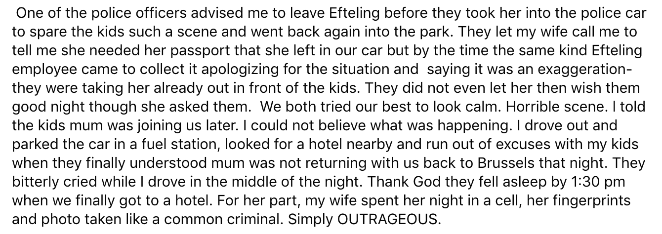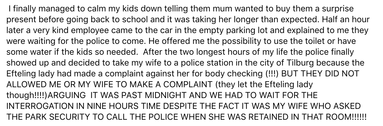De Efteling is een plek waar kinderen en volwassenen de tijd van hun leven zouden moeten hebben. Helaas was dat niet het geval voor een Belgische vrouw en haar autistische zoon. In een post op Facebook vertelt ze dat ze aan het eind van hun bezoek aan de Efteling nog even naar de wc moesten. Omdat het park zou gaan sluiten, werden ze geweigerd, racistisch behandeld en vernederd. Vervolgens liep het zo uit de hand dat de vrouw zelfs een nacht in de cel belandde. Maar volgens Efteling klopt er niet veel van haar verhaal.