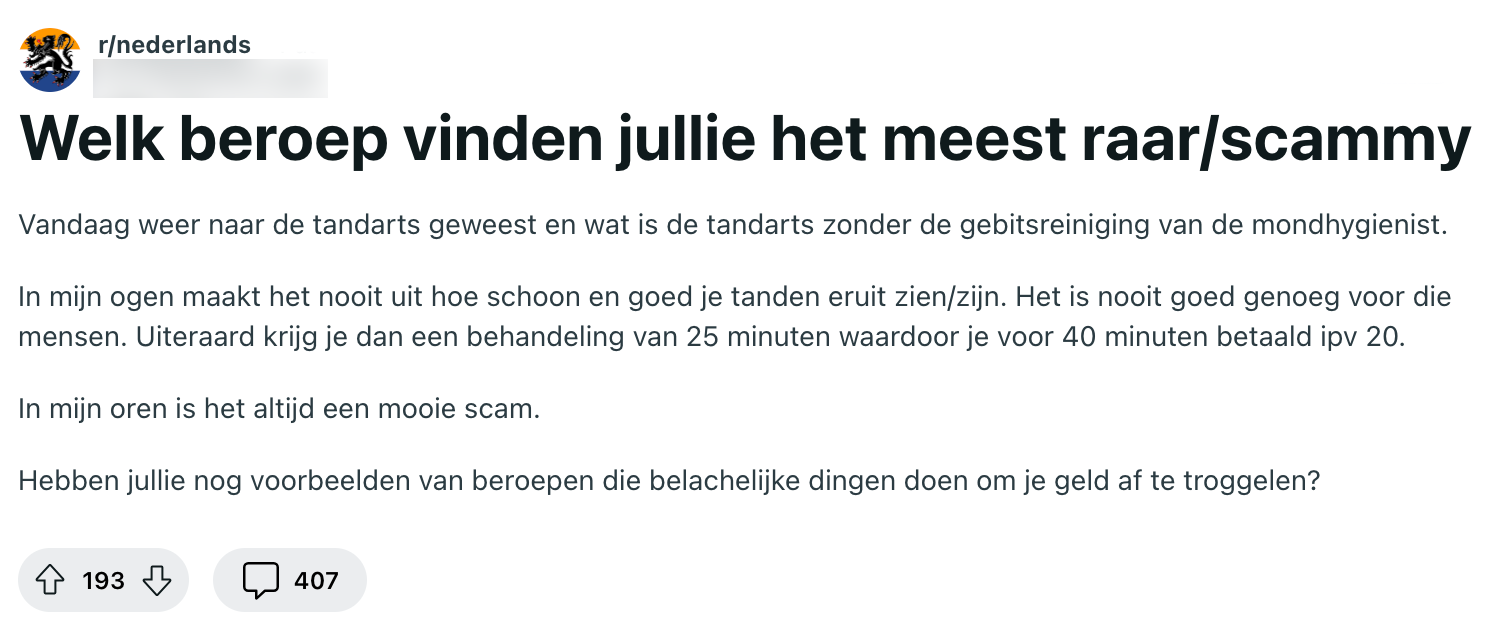Bij ieder halfjaarlijks tandartsbezoekje wordt hier en daar een beetje tandsteen verwijderd én een ietwat prijzige foto van je gebit genomen. Ondanks dat we wel beter weten, trappen we er toch keer op keer weer in en wordt die foto gewoon genomen. Daar gaat je spaargeld… Sommige beroepsgroepen, zoals de tandarts dus, zijn voor geen cent te vertrouwen. Toch was deze Reddit-gebruiker benieuwd of er nóg meer van dit soort beroepen zijn en we stonden met onze mond vol tanden door de reacties.