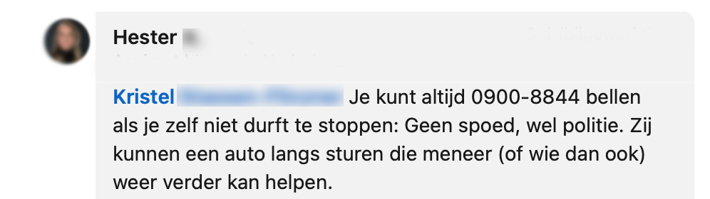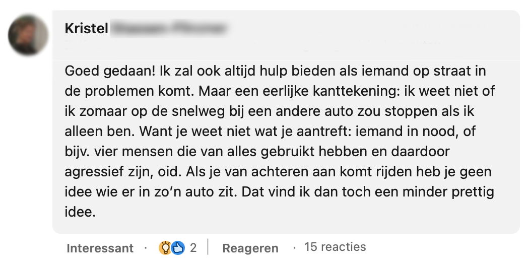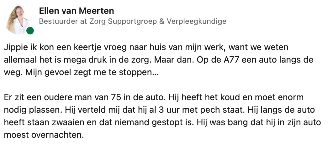 Als er een ongeluk op de snelweg gebeurt, is het vrij duidelijk wat je moet doen: de politie bellen. Maar wat als een auto ‘gewoon’ stilstaat op de vluchtstrook? Wanneer Ellen een auto langs de kant van de weg ziet staan, twijfelt ze geen moment. Ze besluit óók op de vluchtstrook te stoppen – en dat blijkt achteraf een erg goede ingeving te zijn geweest…