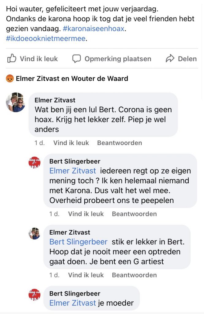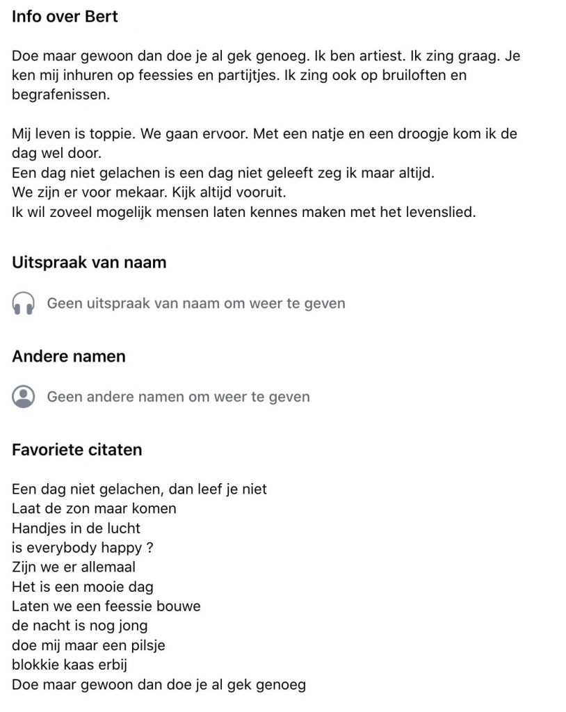 Mijn broer heeft een jaar of 15 geleden een alter ego op Facebook aangemaakt, de simpele volkszanger Bert Slingerbeer (type Handjes de lucht in, Landsmeer laat je hooruuuuh!!!)