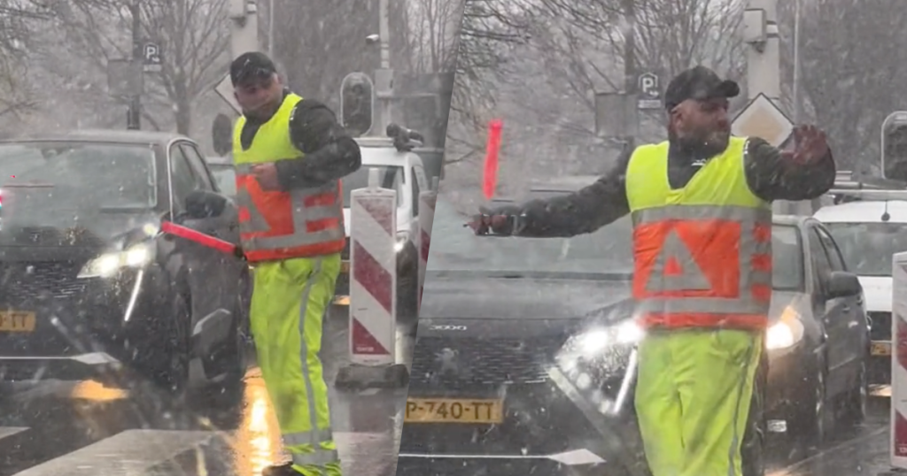 Een dag kan soms vol zitten met tegenslagen. Ondanks dat het soms moeilijk is om tegenslagen om te draaien naar iets positiefs, lukt het sommige mensen aardig goed. Deze wegwerker maakte ondanks het vervelende weer een feestje van zijn werk.