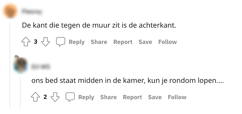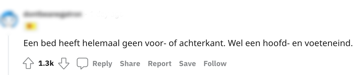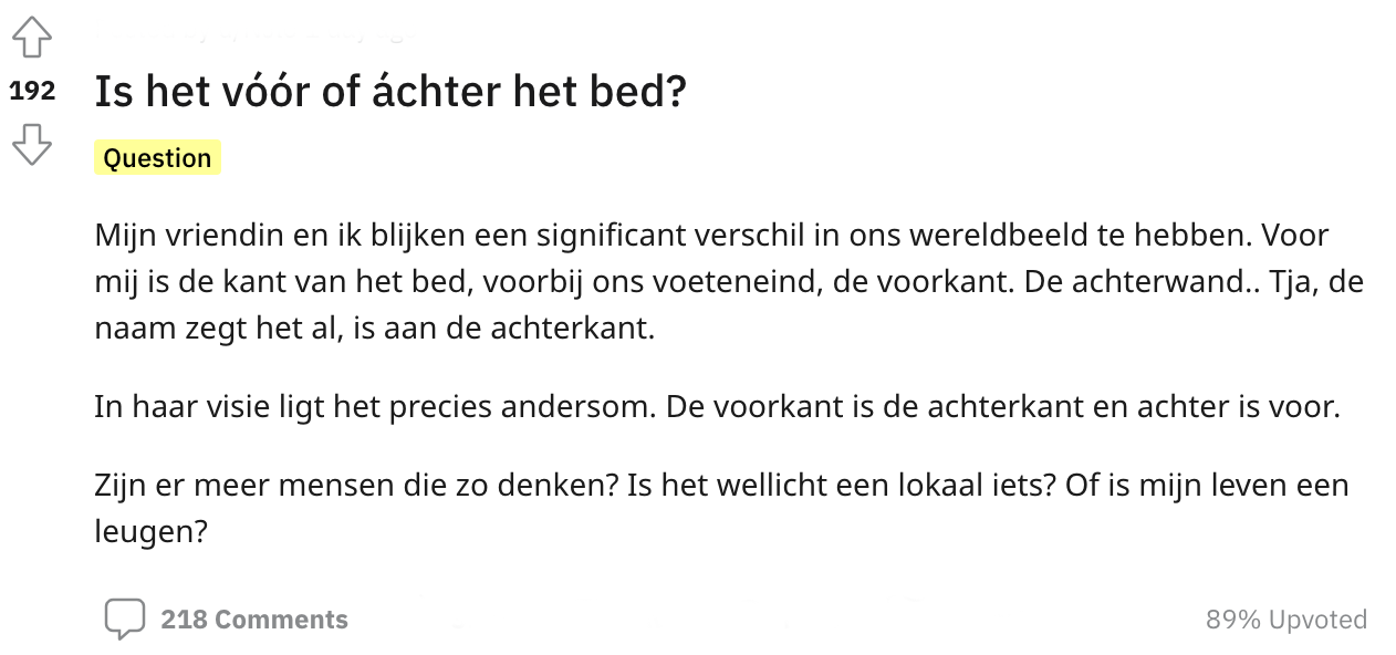 Kijk: je kan het niet over alles eens zijn in een relatie. Jij zegt friet en je partner zegt misschien wel patat, dat ligt gewoon aan de plek waar je vandaan komt. Maar wat als je allebei een ander perspectief hebt over het ding wat jullie elke avond delen: het bed. Een Redditer deelt zijn probleem: hij ziet de kant van het hoofd als achterkant van het bed en de kant waar je voeten liggen als voorkant. Zijn vriendin denkt dat precies andersom om. Op Reddit vraagt hij hoe andere mensen hier over denken en een discussie barst los.