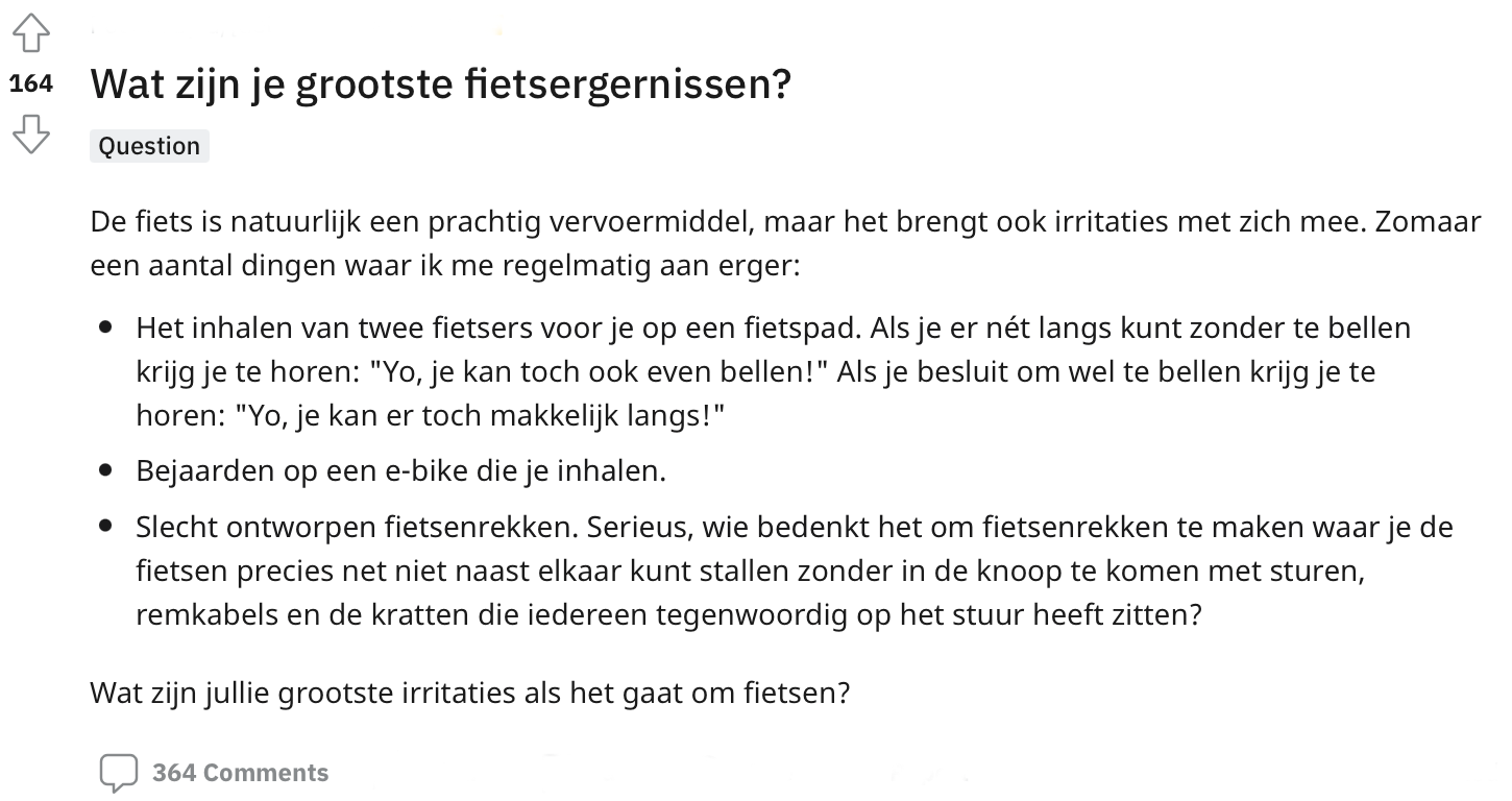 In Nederland zijn meer fietsen dan mensen. Of we nu naar ons werk gaan, naar de kroeg of naar de kringverjaardag van ome Jos: we zijn nergens zonder onze fiets. Toch is het niet altijd alleen maar bandengeur en fietslamp-schijn. Het zijn namelijk vaak andere weggebruikers die roet in het eten gooien (of een stok tussen je spaken steken). Maar wat zijn nu echt de grootste ergernissen van fietsers? Laten we het zo zeggen: met deze dingen hebben fietsers nu niet bepaald een band.