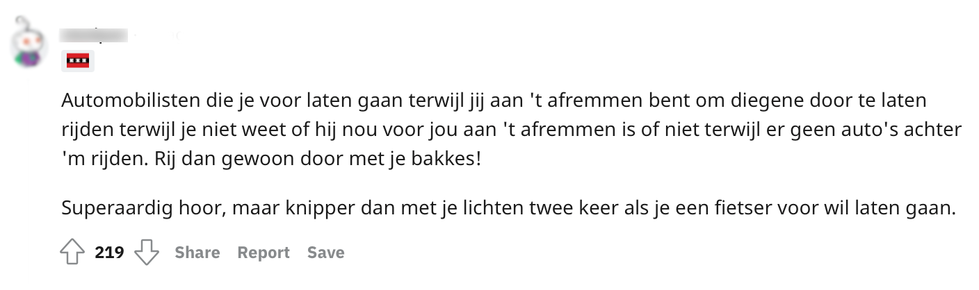 2. Ook automobilisten zitten ‘ons fietsers’ irritant vaak in de weg. Of ze geven je opeens voorrang: doe eens effe normaal joh!