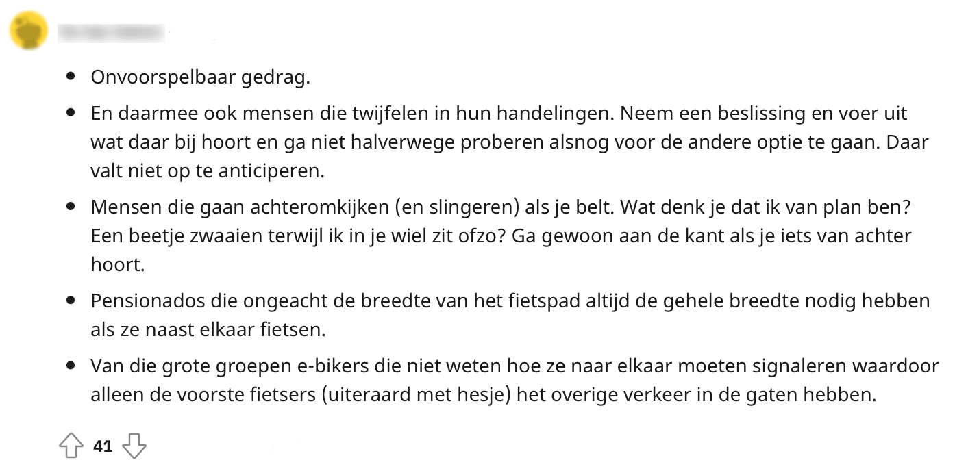 In Nederland zijn meer fietsen dan mensen. Of we nu naar ons werk gaan, naar de kroeg of naar de kringverjaardag van ome Jos: we zijn nergens zonder onze fiets. Toch is het niet altijd alleen maar bandengeur en fietslamp-schijn. Het zijn namelijk vaak andere weggebruikers die roet in het eten gooien (of een stok tussen je spaken steken). Maar wat zijn nu echt de grootste ergernissen van fietsers? Laten we het zo zeggen: met deze dingen hebben fietsers nu niet bepaald een band.
