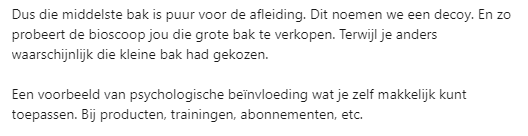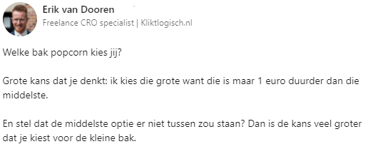 Sommige marketing trucs zijn inmiddels algemeen bekend. Van Black Friday tot de ‘light’ producten, we trappen er allemaal wel eens in. In deze LinkedIn post legt Erik van Dooren je kort en krachtig uit hoe je beïnvloed wordt door bijvoorbeeld popcorn in de bioscoop. En dat opent zelfs onze ogen.