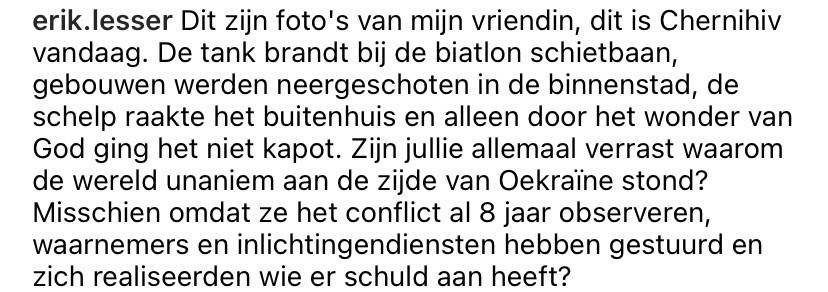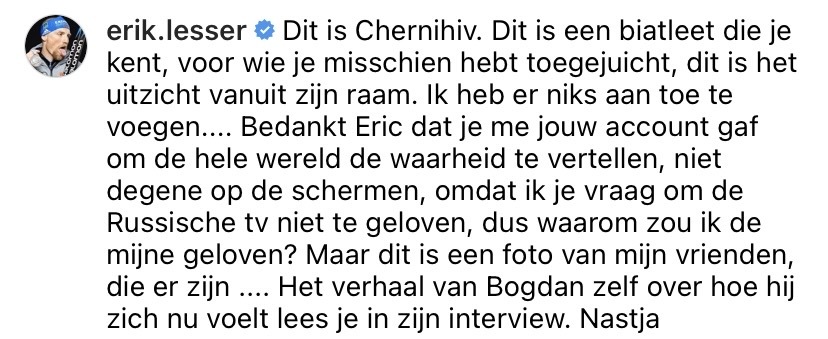 1. De Oekraïense biathleet Anastasiya Merkushyna neemt het Instagram account van Erik over. Ze omschrijft dat het in de huidige oorlog soms lastig is om betrouwbare beelden te vinden. Daarom deelt ze alleen foto’s die door haar vrienden of familie gemaakt zijn.
