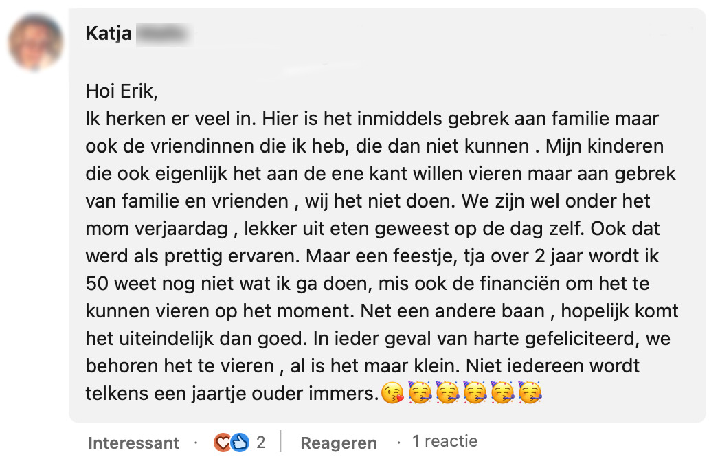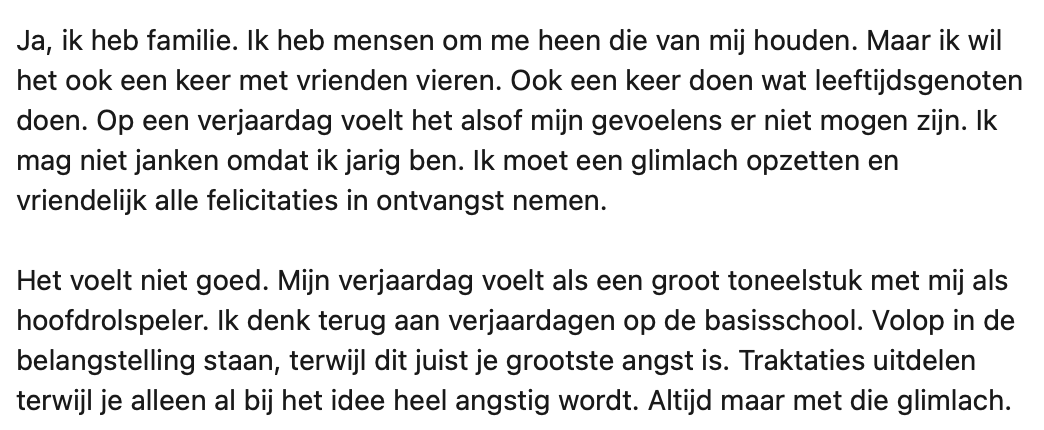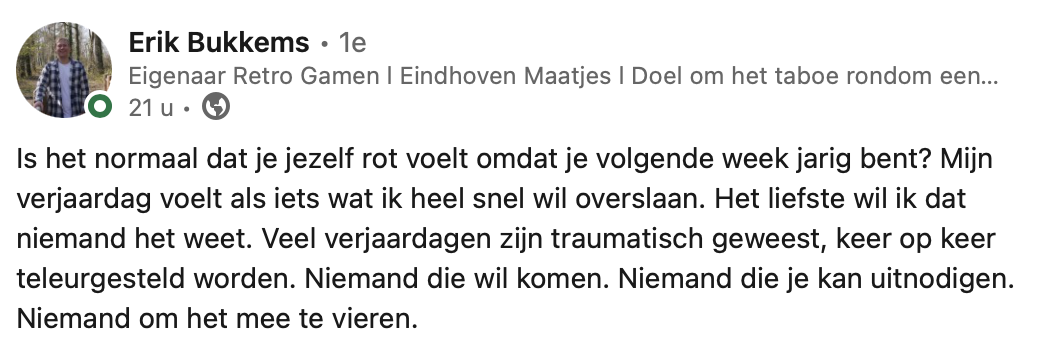 Voor veel mensen is hun verjaardag een gelegenheid om naar uit te kijken. Maar dit geldt lang niet voor iedereen. Dat blijkt wel uit het dappere bericht dat Erik op LinkedIn deelt. Doordat zijn verjaardag vroeger vaak traumatisch is geweest, wil hij het liever niet vieren. Uit de reacties blijkt dat meer mensen dit ervaren.