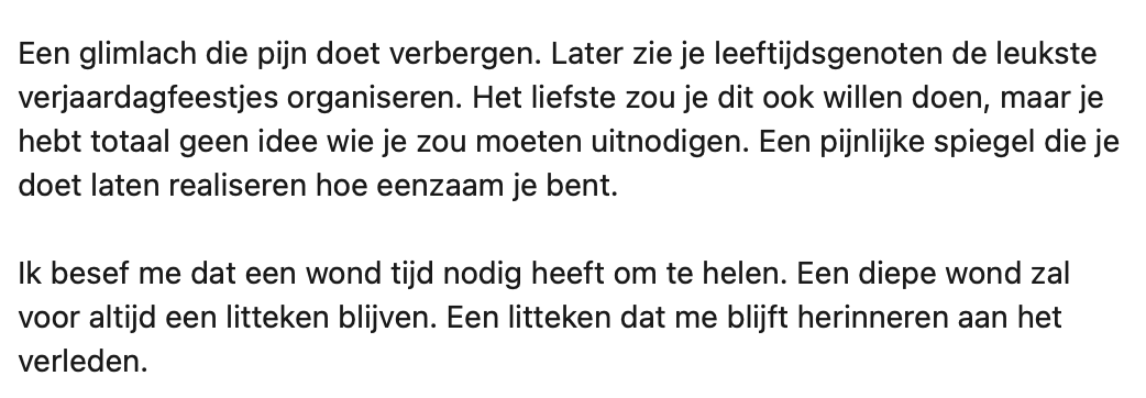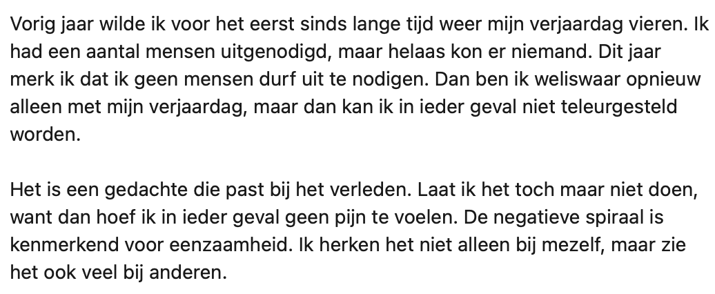3. Om zich heen ziet hij leeftijdgenoten wél verjaardagsfeesten organiseren en dit versterkt zijn gevoel van eenzaamheid.