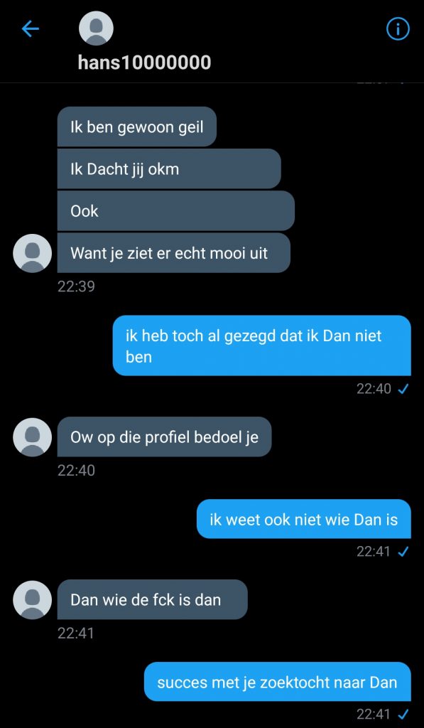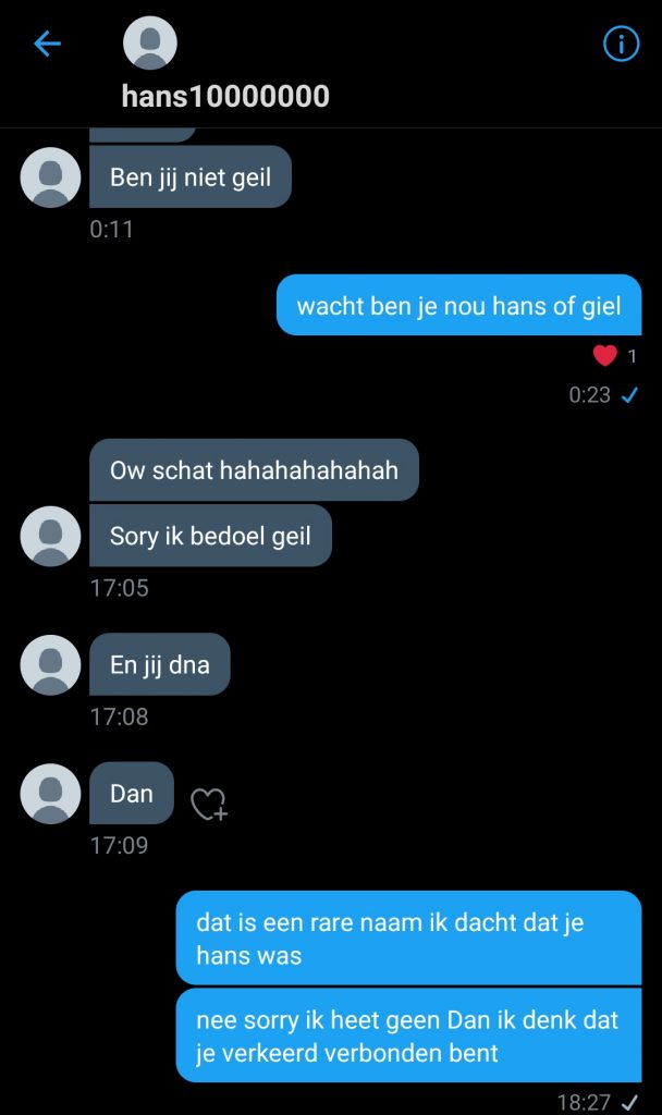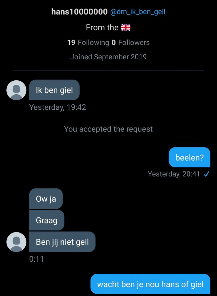 Het gebeurt helaas nog veel te vaak dat mensen ongewenste DM’s krijgen van iemand die ze niet kennen. Je kunt iemand natuurlijk meteen blokkeren, maar je kan ook gewoon even meespelen. Esmee hield zich volledig van de domme en dat zorgde voor een interessant gesprek.