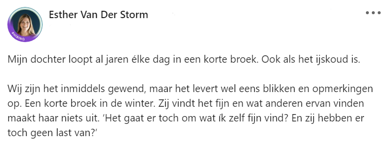 1. Dit is het LinkedIn-bericht waarin Esther vertelde dat haar dochter elke dag in een korte broek rondloopt.