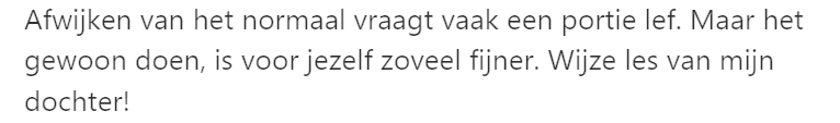 3. Het moraal van het verhaal is dat het juist fijn is dat er mensen afwijken van het ‘normaal’. En gelukkig is de definitie hiervan voor iedereen anders.